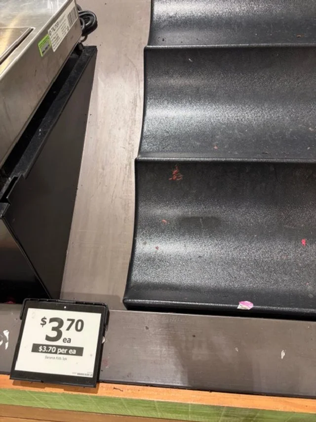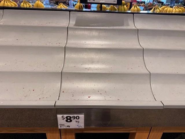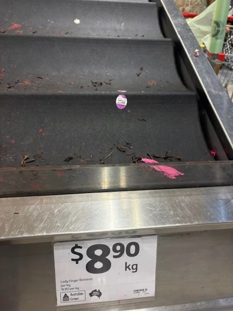 Cavendish Bananas priced at $4.49/kg. Main display backward in condition, carryover stock with good colour. Again some dull fruit and sap staining present.