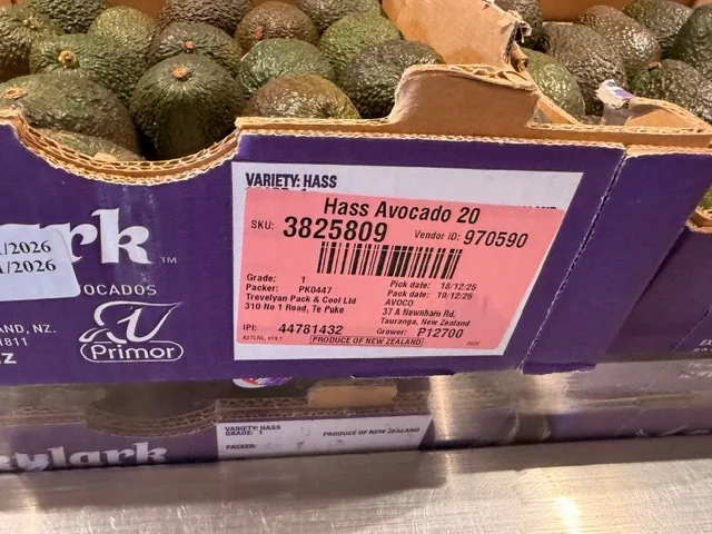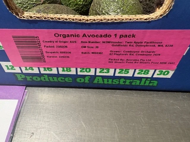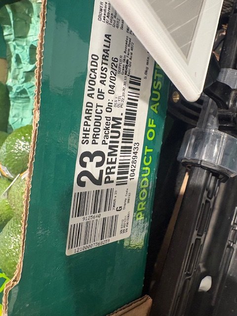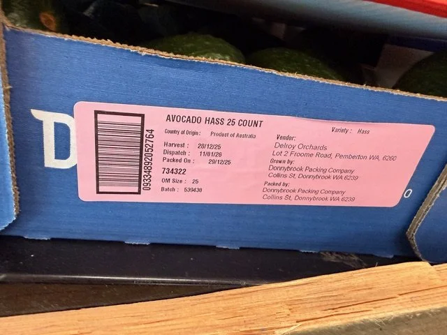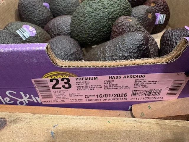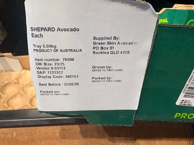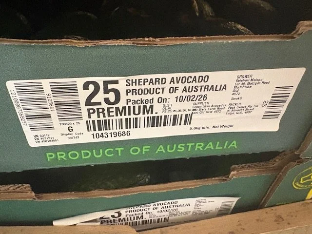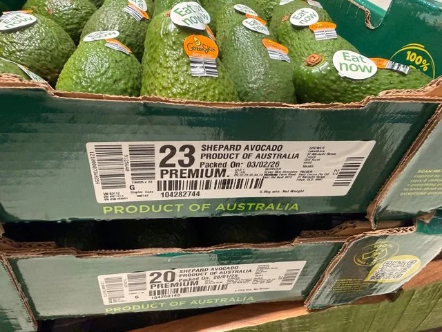 Greenskins Ct 23 SHEPARDS ticketed at $1.49ea. A few pieces with limey skin colour which usually indicates immature fruit. Fruit packed 12th Feb so fruit age is 20 days old. Also note Aldi catalogue this week features “Autumn Delights” which they clearly include the Shepard Avocado and feature recipes etc.