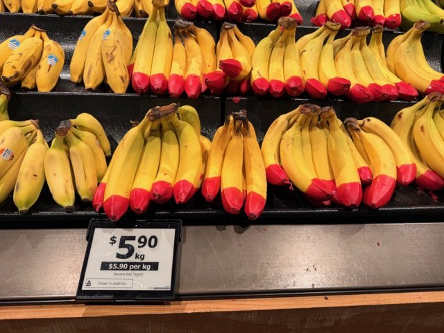 Red Tipped bananas at $5.90/kg and Sly Fox Lady Fingers at $8.00/kg. Organic at $5.90/kg.