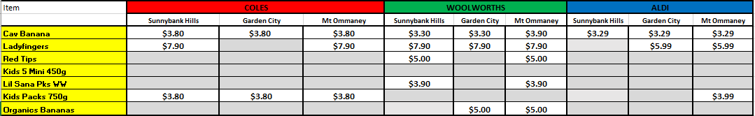 Retail ticket pricing in Queensland for cavendish varied between the major supermarkets with Aldi offering fruit at $3.29/kg; Woolworths at $3.30 to $3.90/kg and Coles offering fruit at $3.50 to $3.90/kg dependent upon the store locality. The independent at one outlet had cavendish at $2.99/kg.