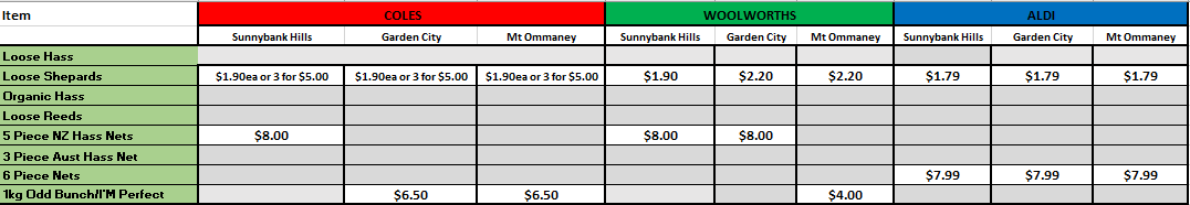 Count 25 Shepard Avocados supplied by Costa’s packed 24th March therefore 14 days old as well as some Obie; avos were priced at $1.79ea and 6 piece packs were $7.99/net