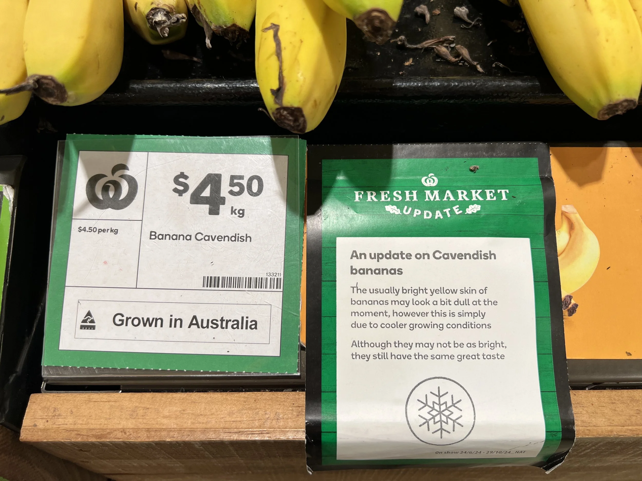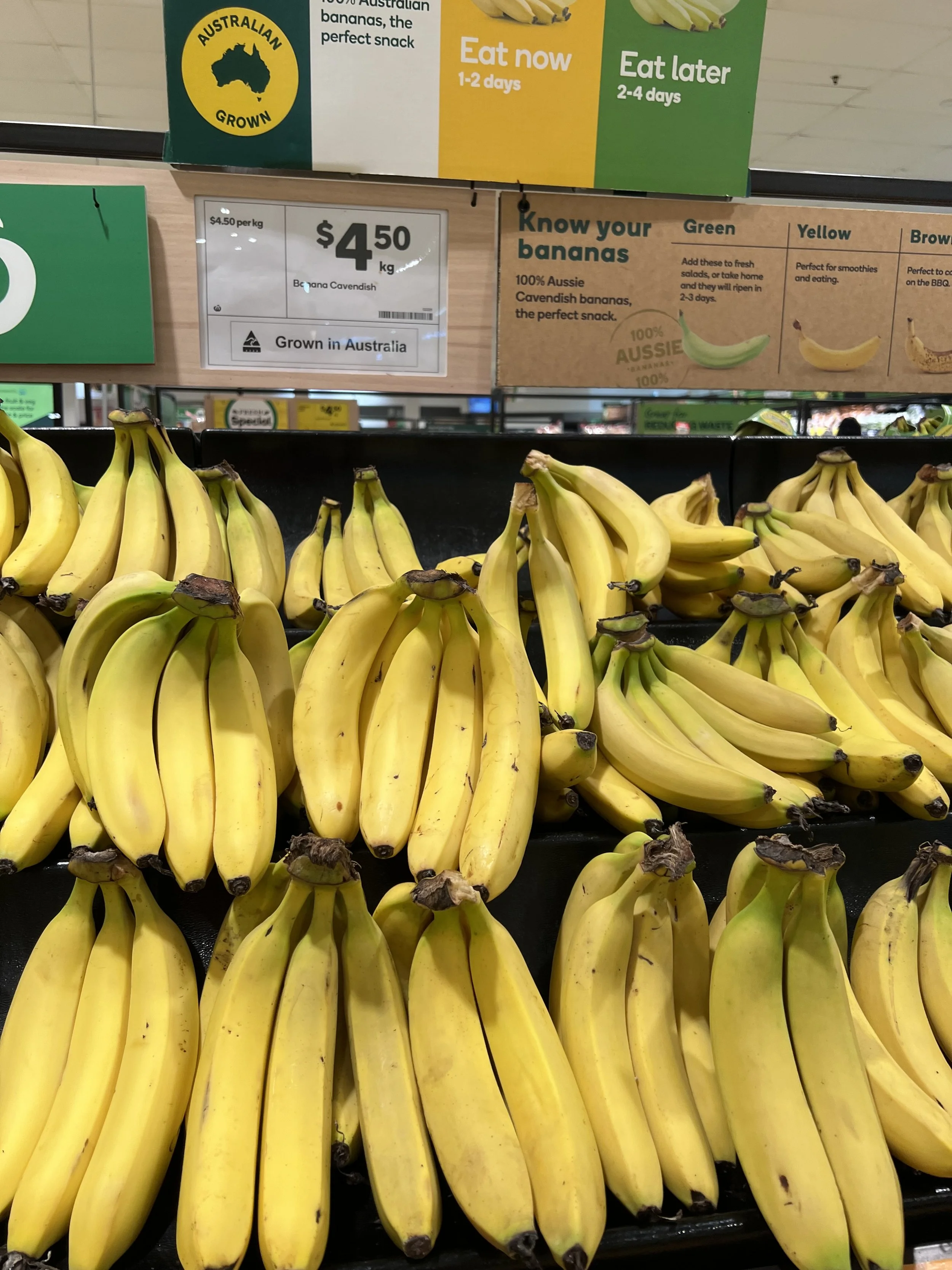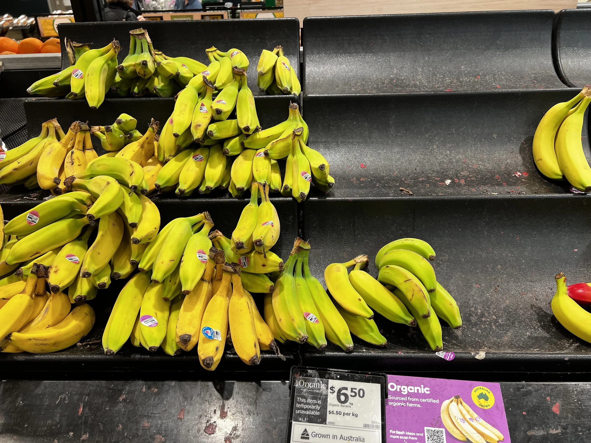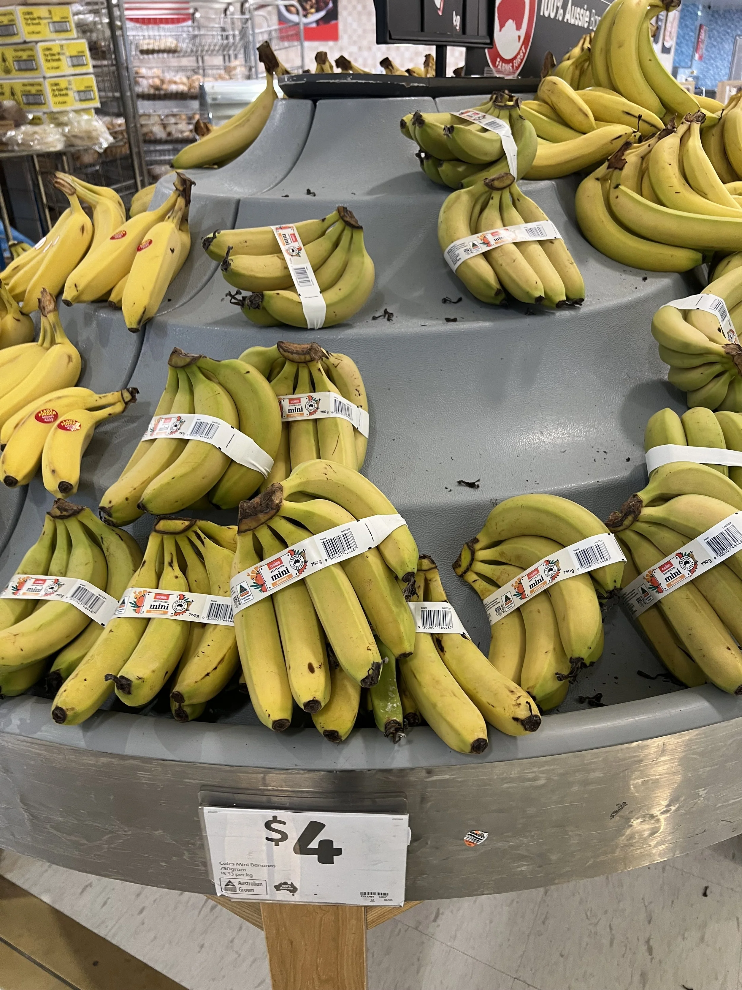 The display of Cavendish priced at $4.50/kg. Good colour and appropriately sectioned in ‘Eat Now’ and ‘Eat Later’. Kids packs at $3.50ea.