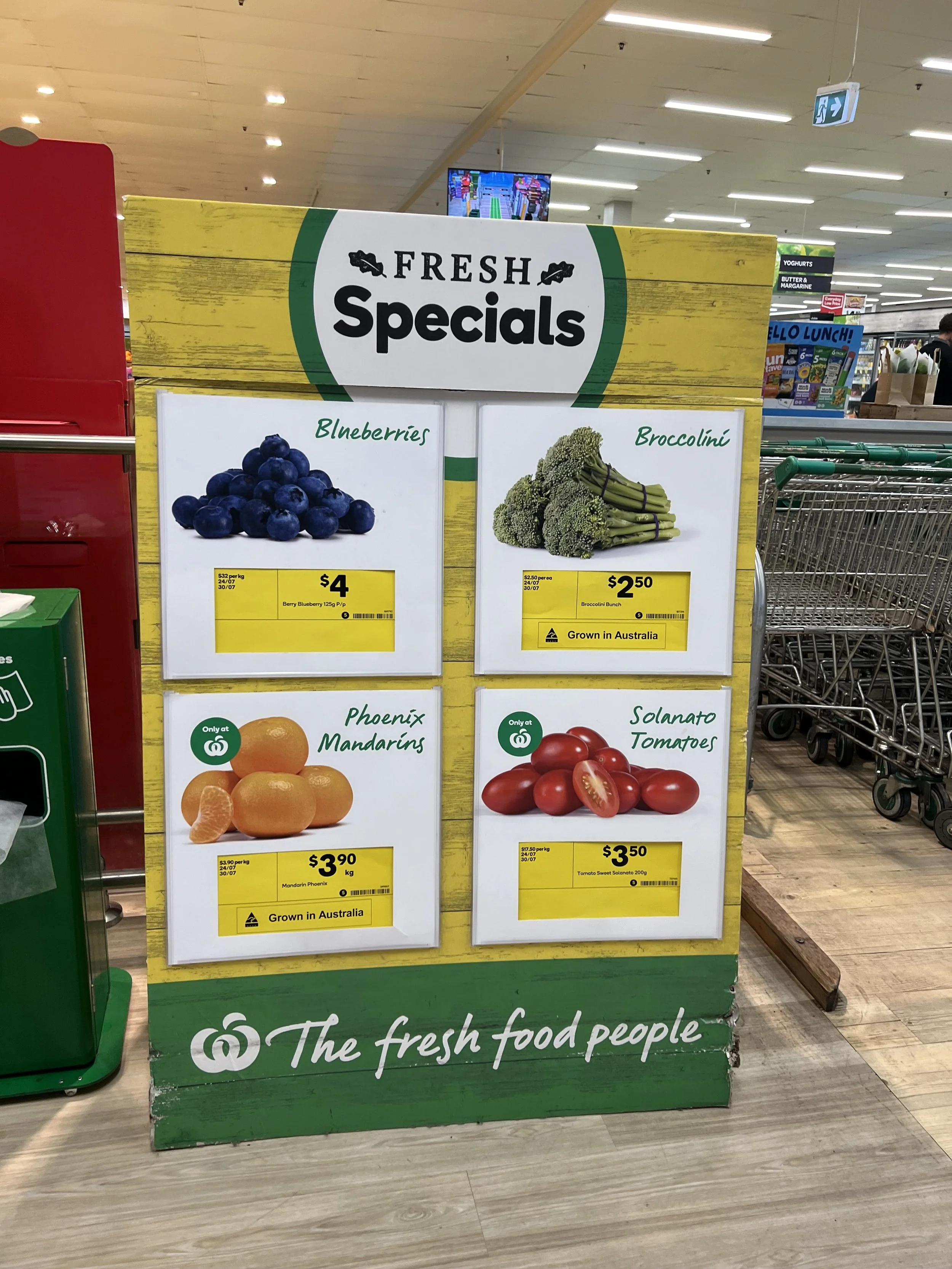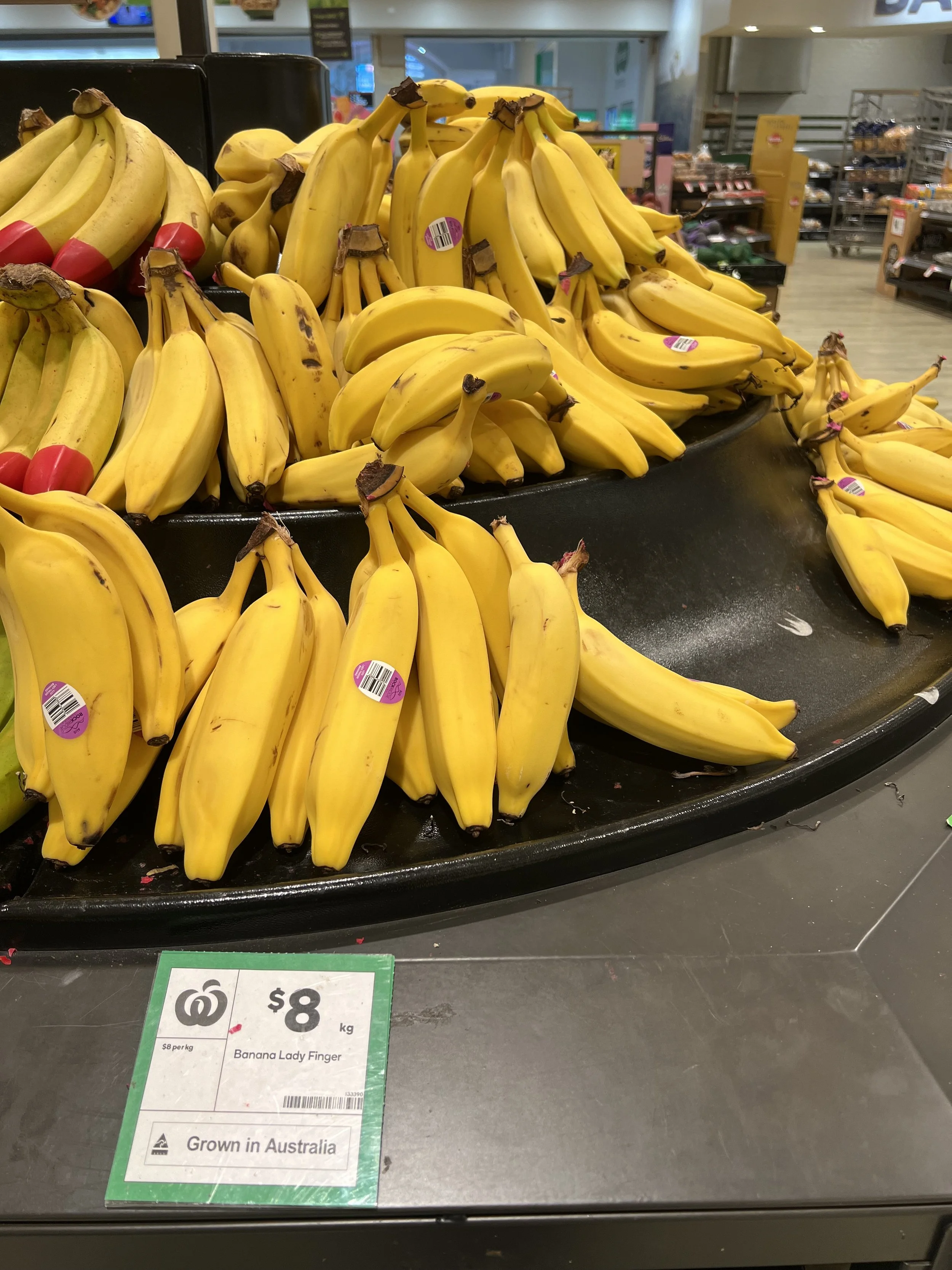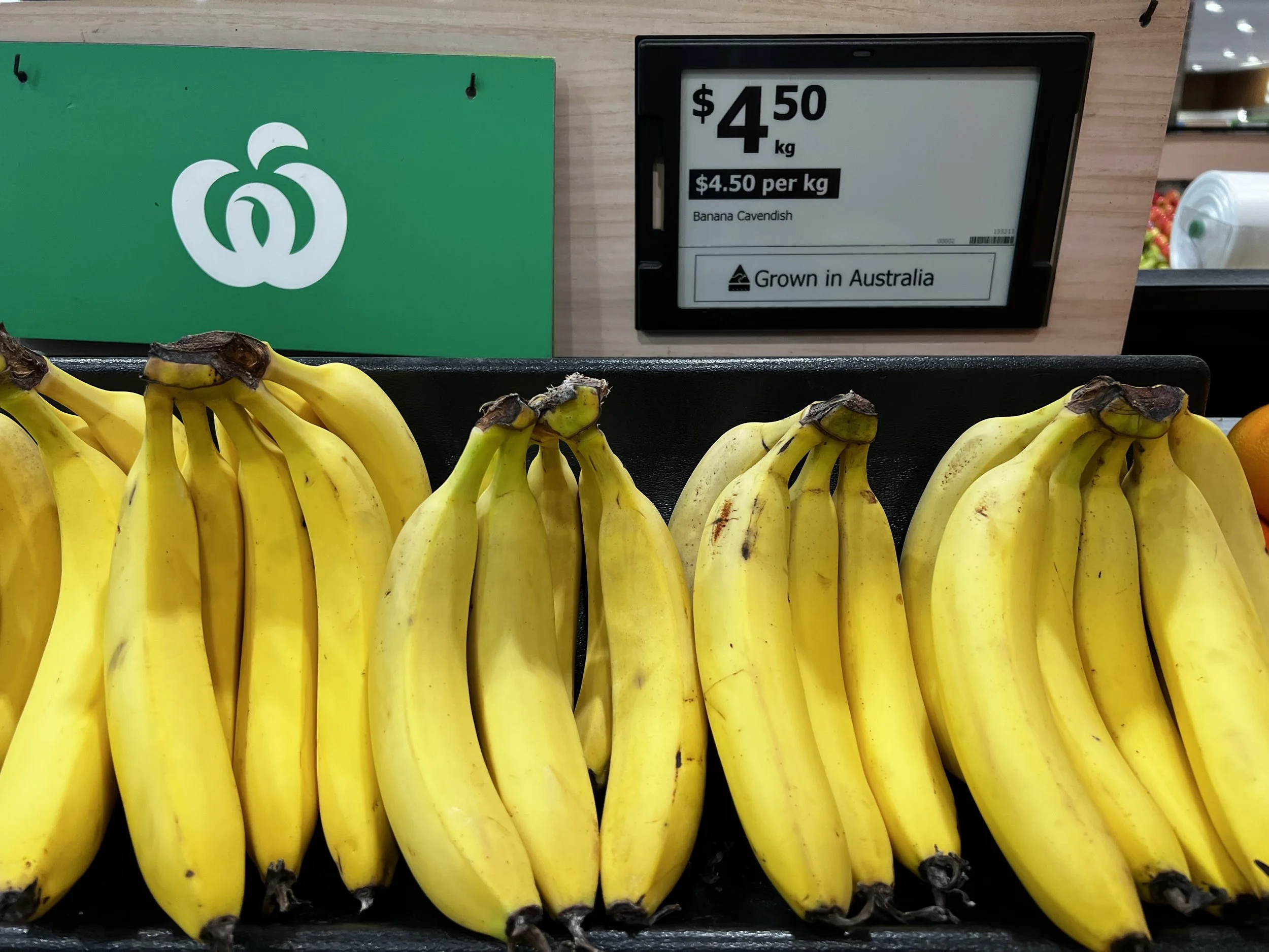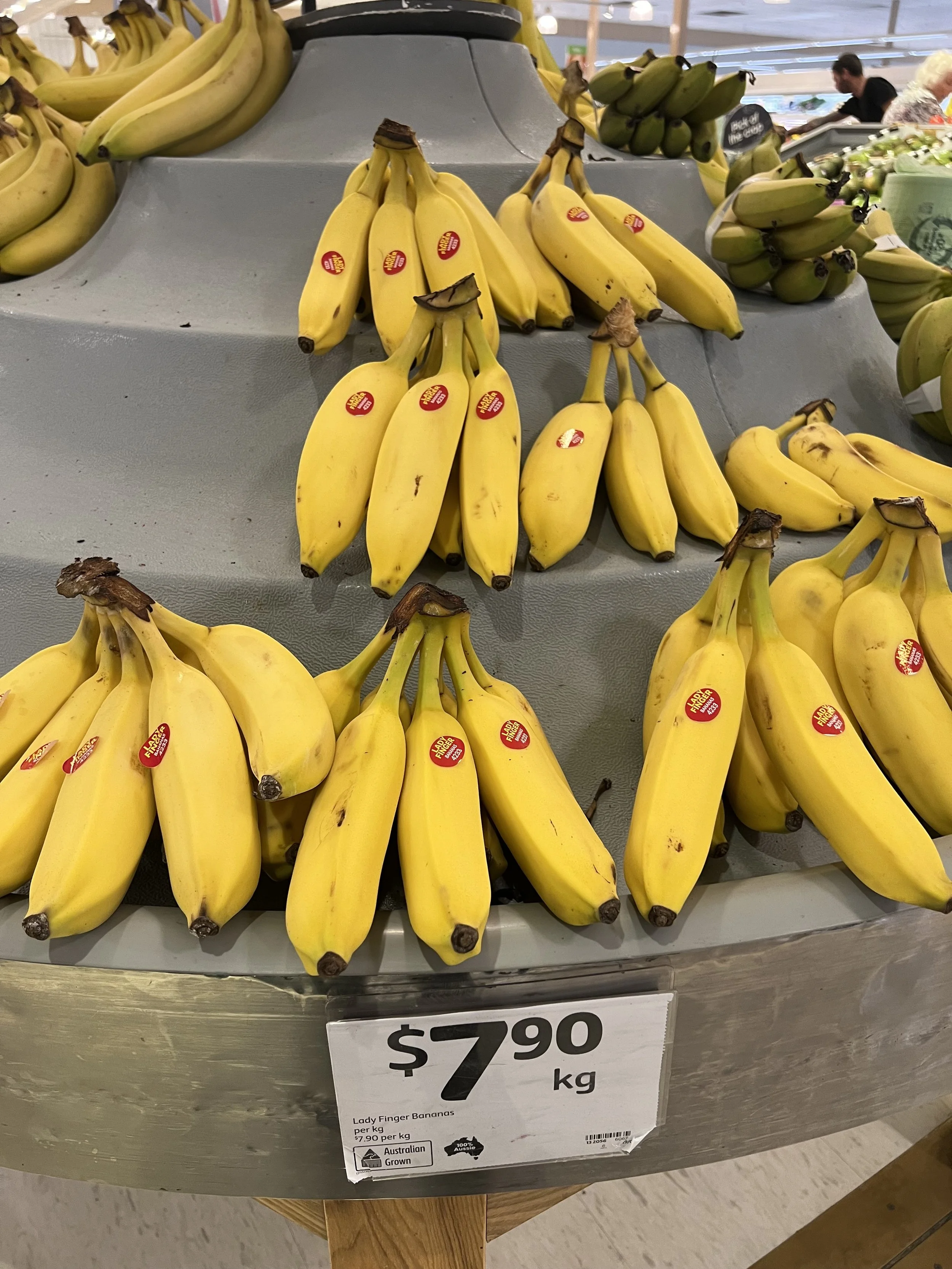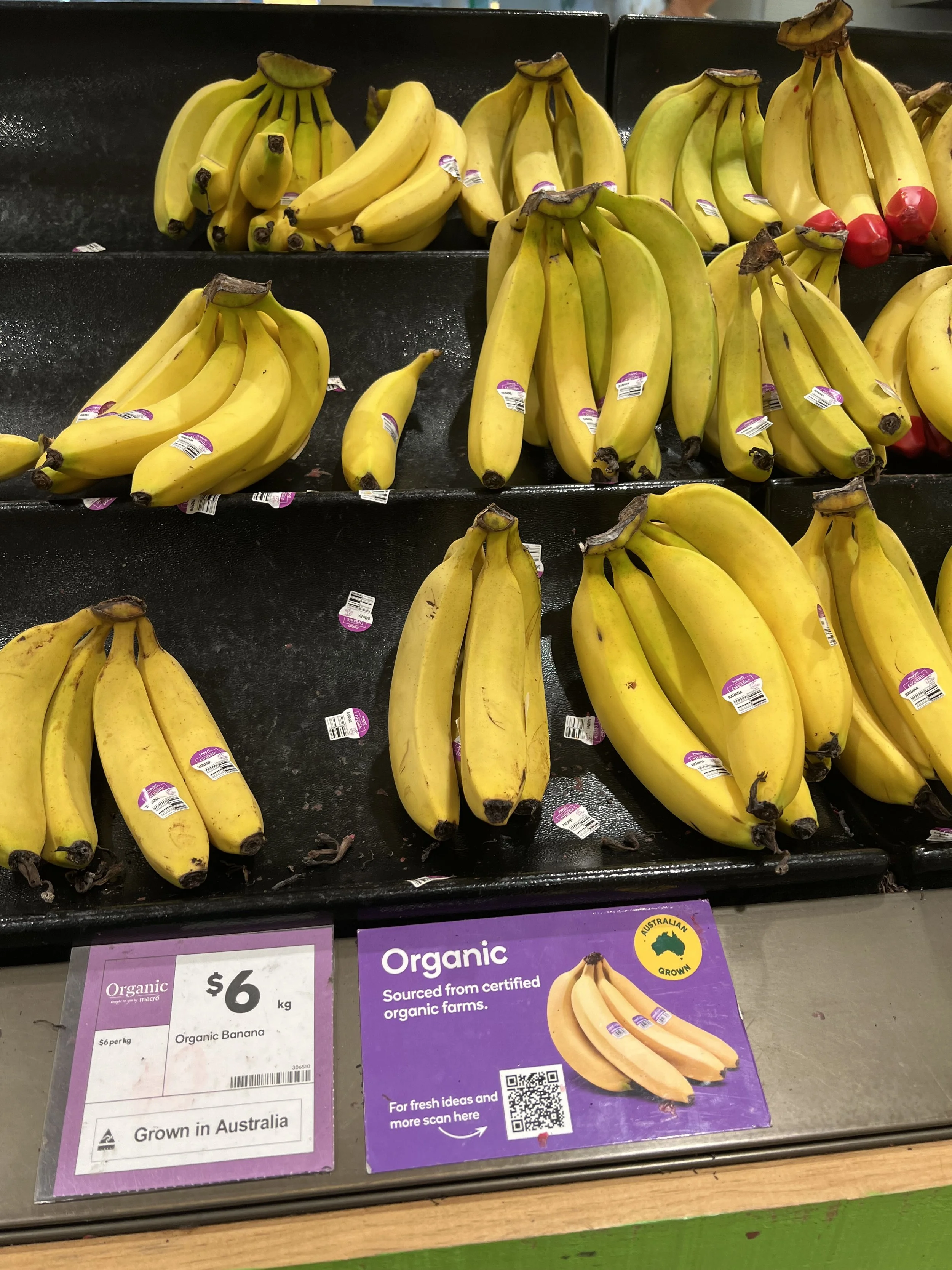 The display of Cavendish priced at $4.50/kg. Good colour and appropriately sectioned in ‘Eat Now’ and ‘Eat Later’. Kids packs at $3.50ea.