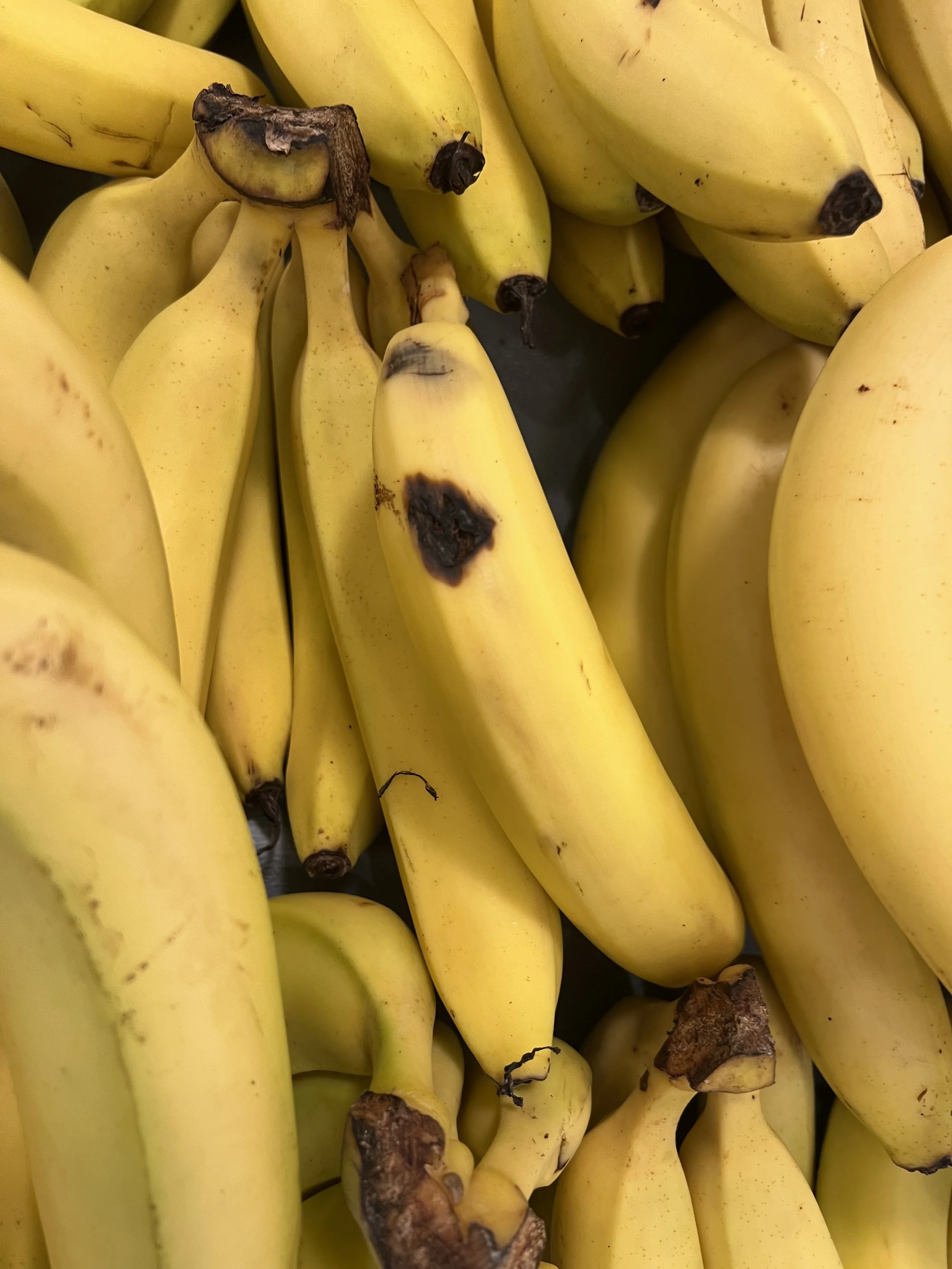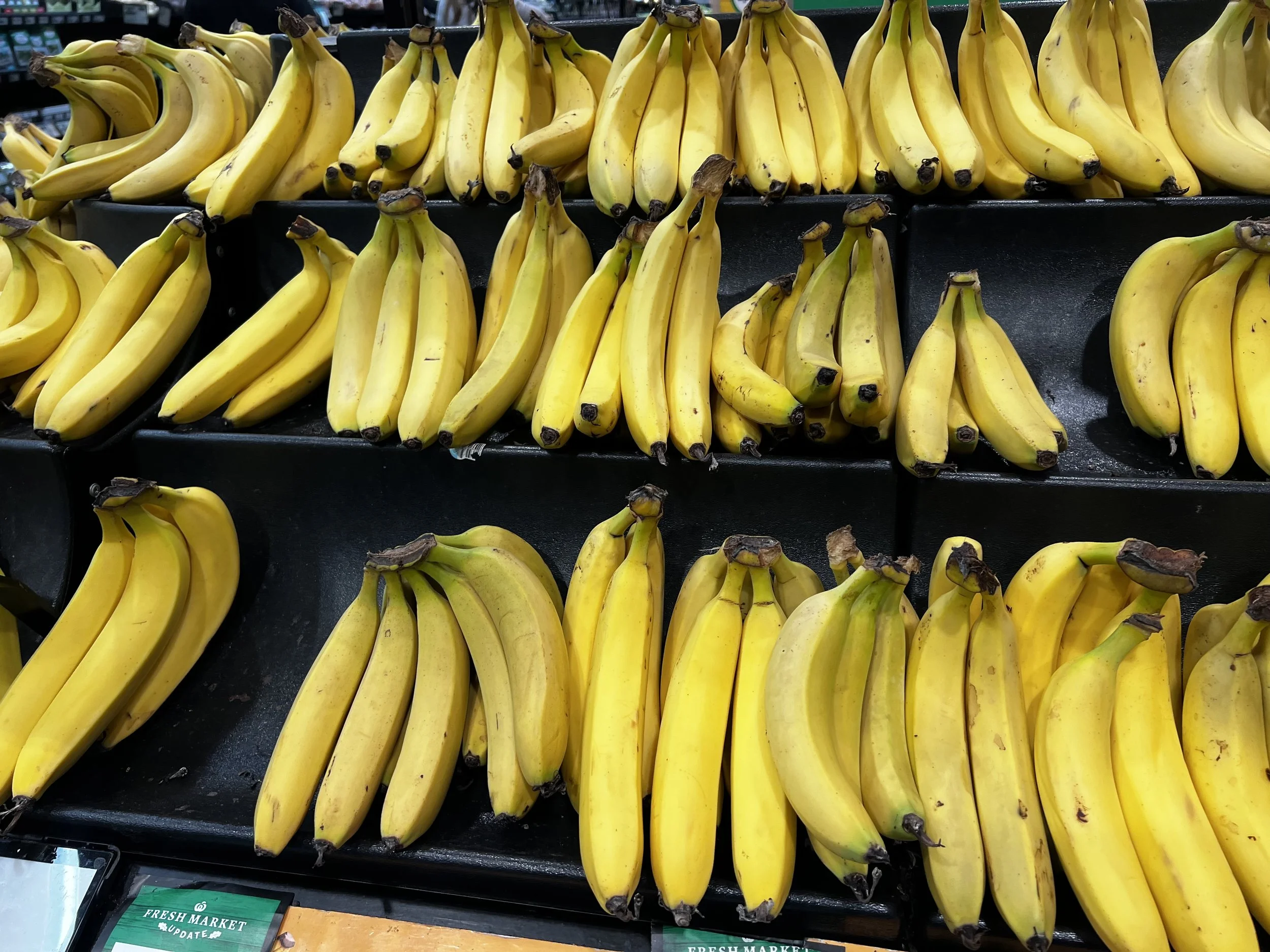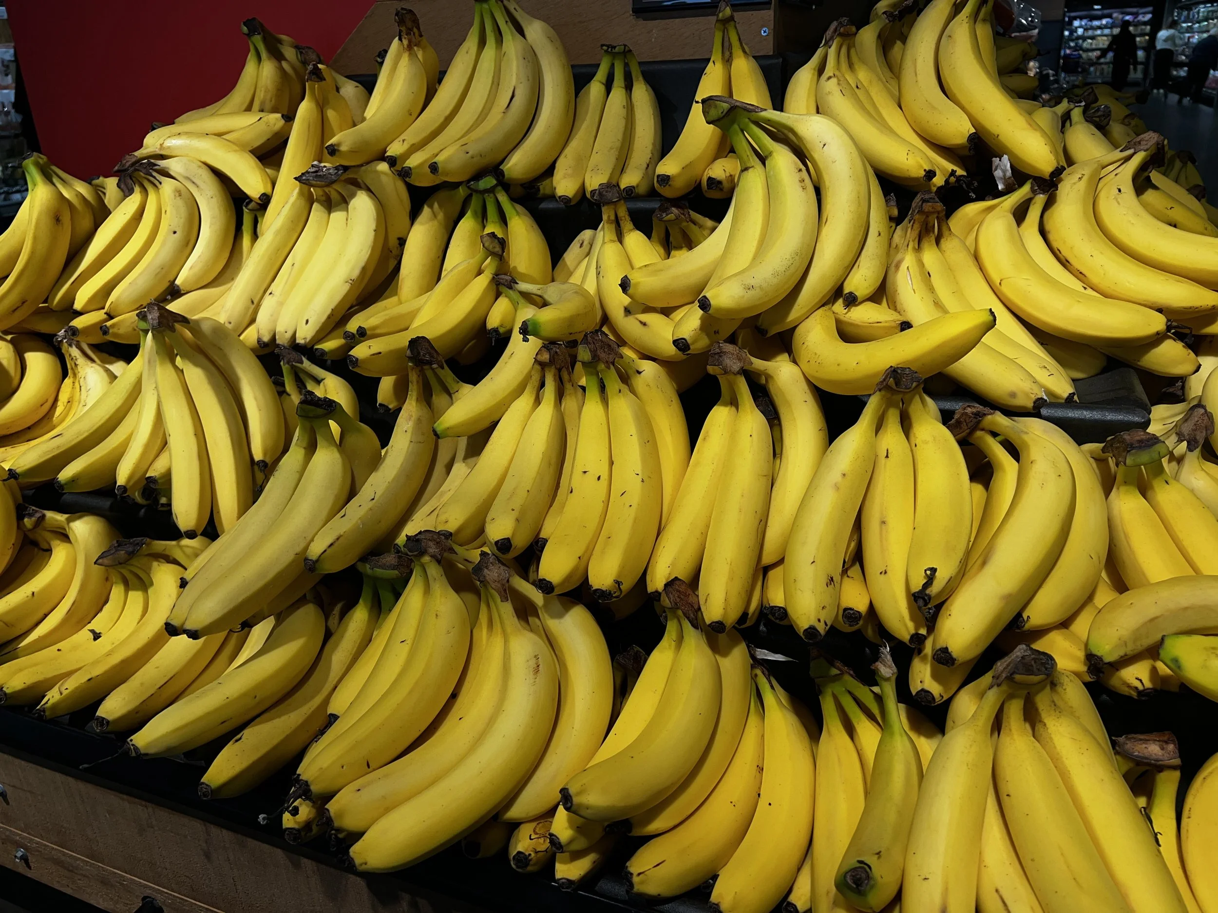 A display of Cavendish Bananas ticketed at $3.99/kg - a few cuts and bruising observed.