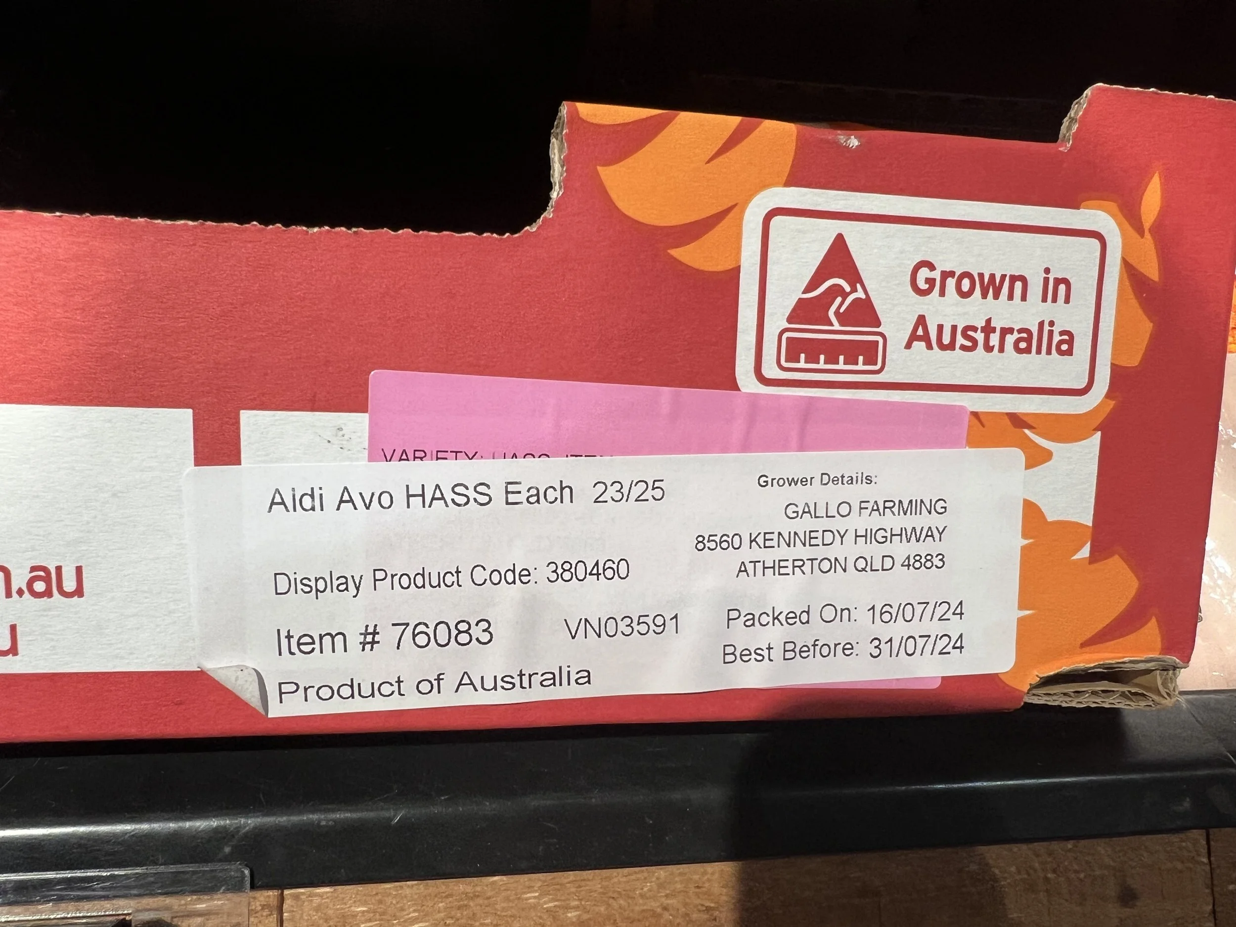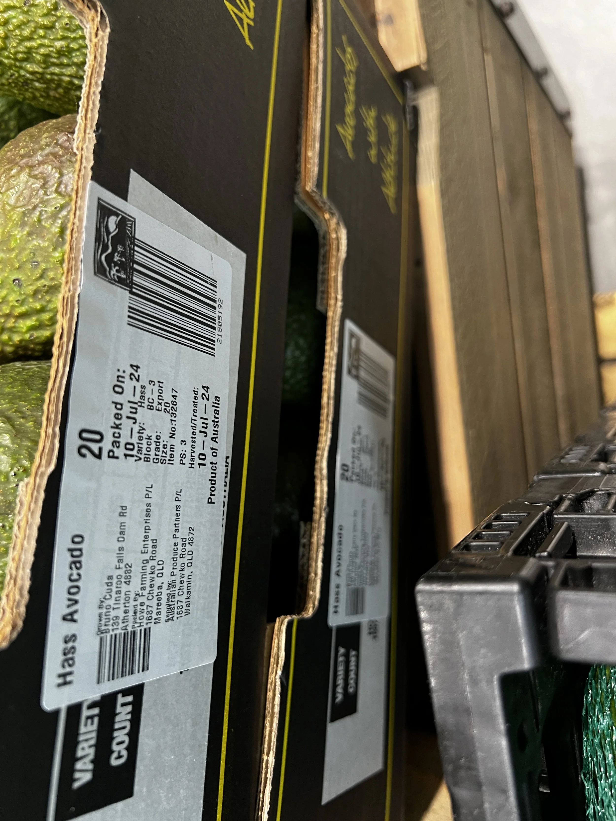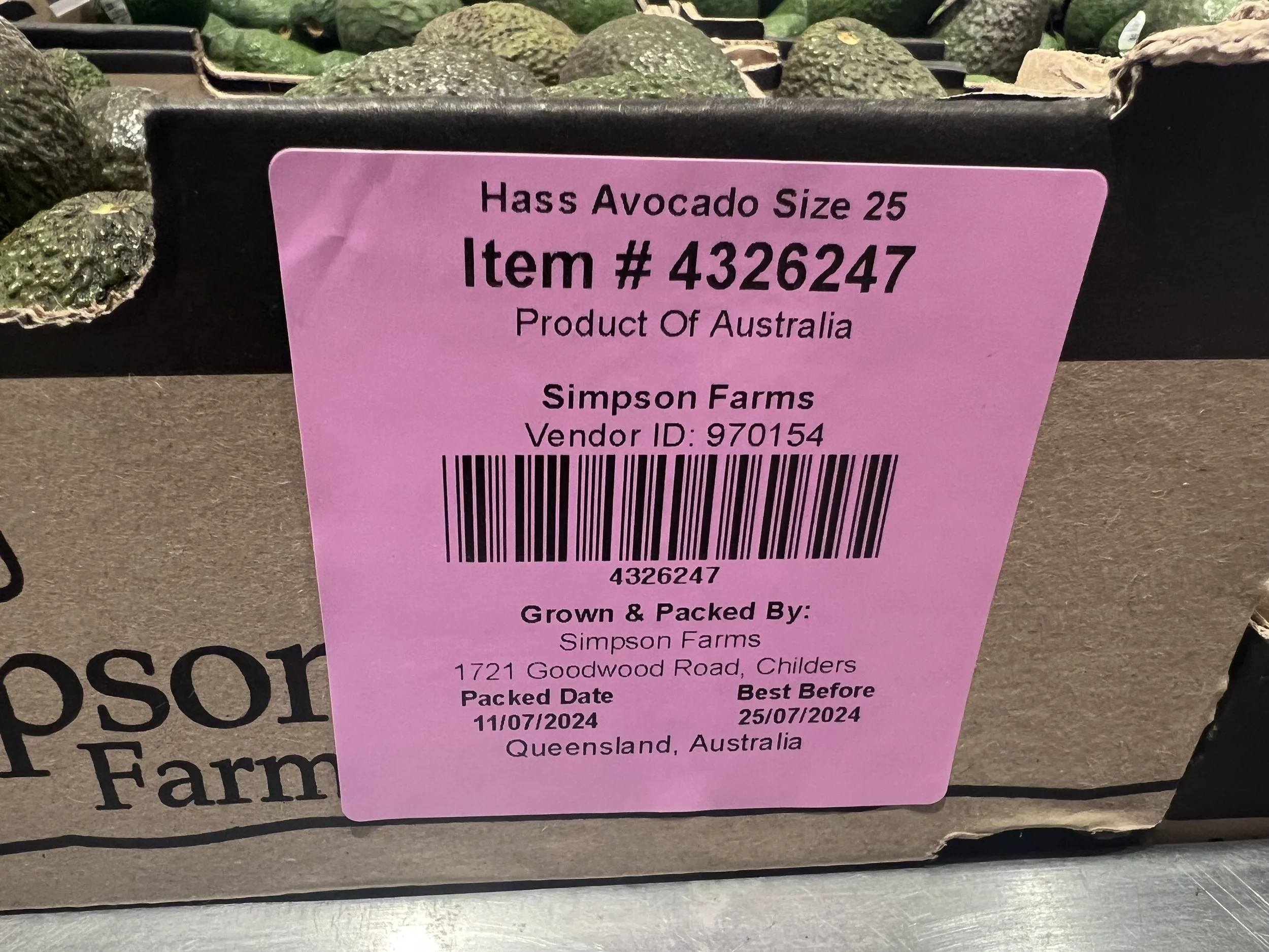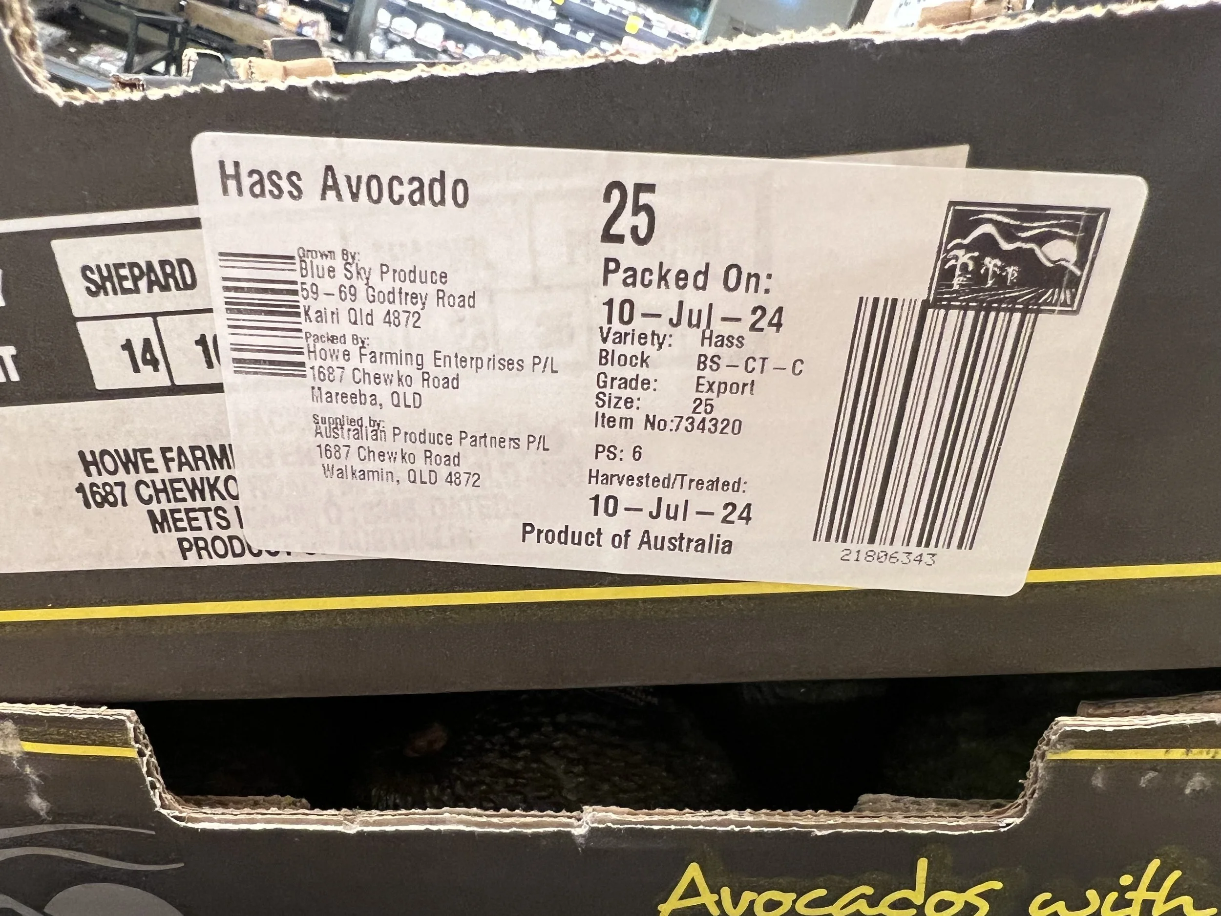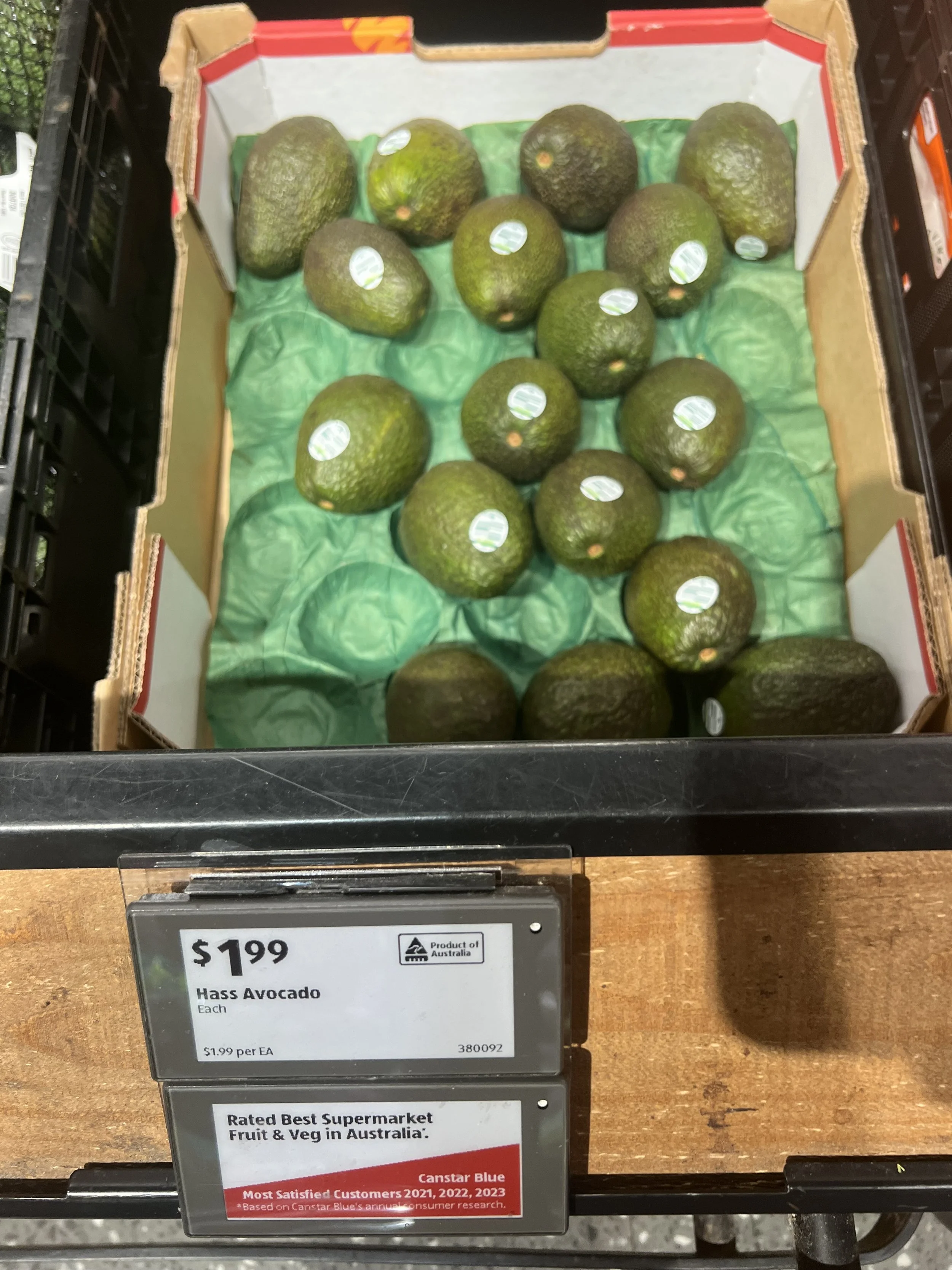 Count 23/25 Hass Avocados priced at $1.99 ea. Packed on 16th July so fruit is therefore 8 days old.