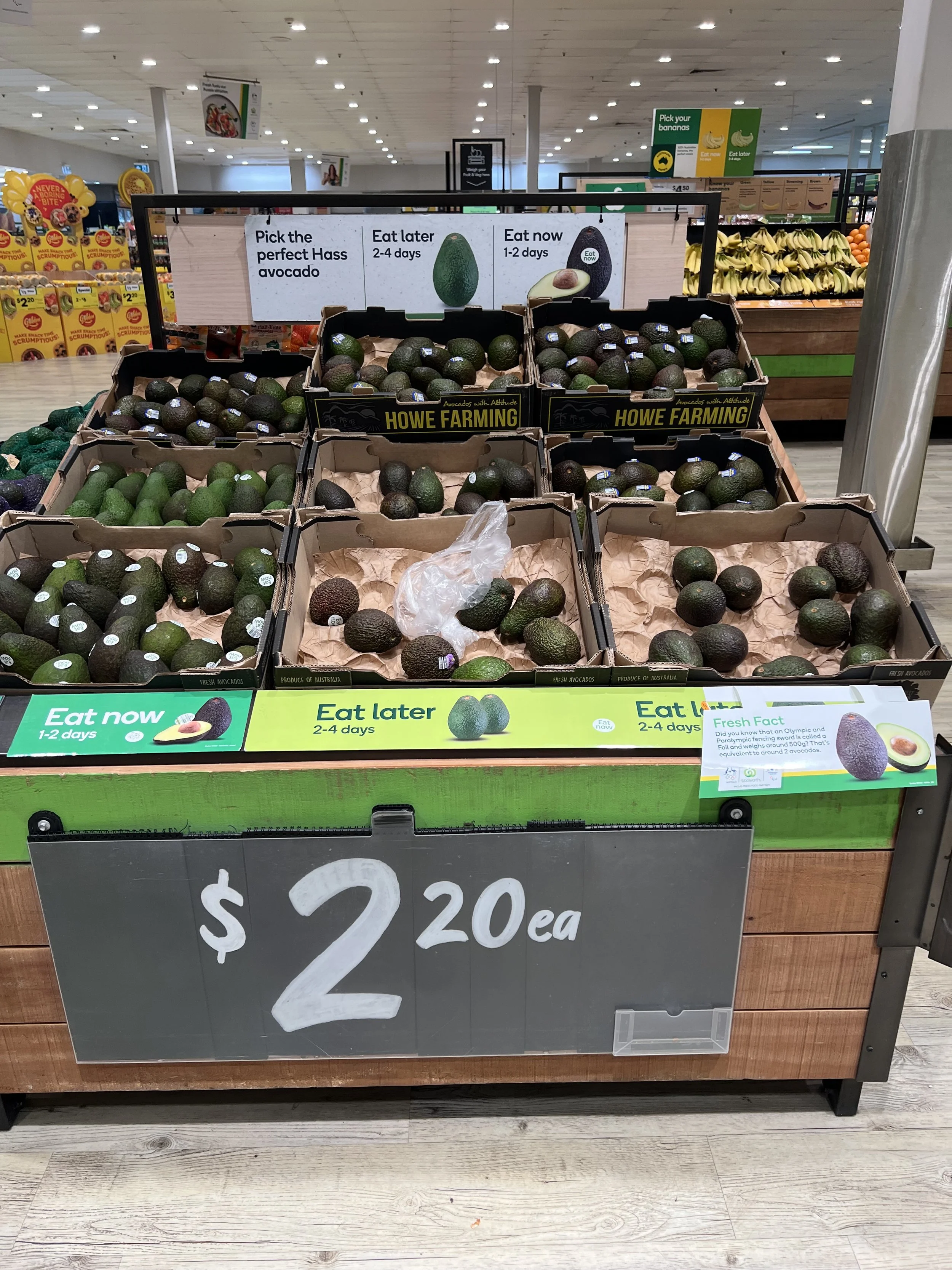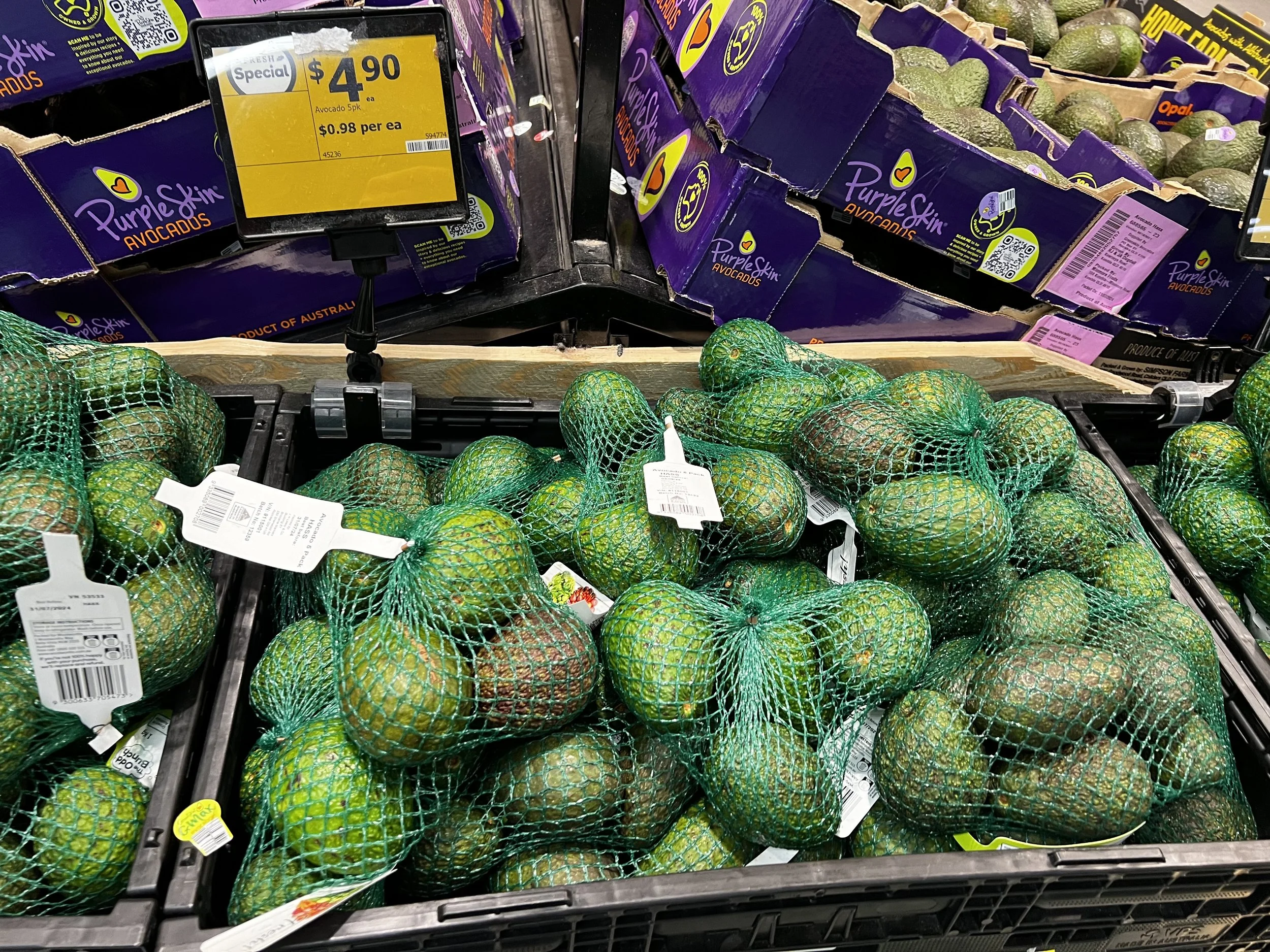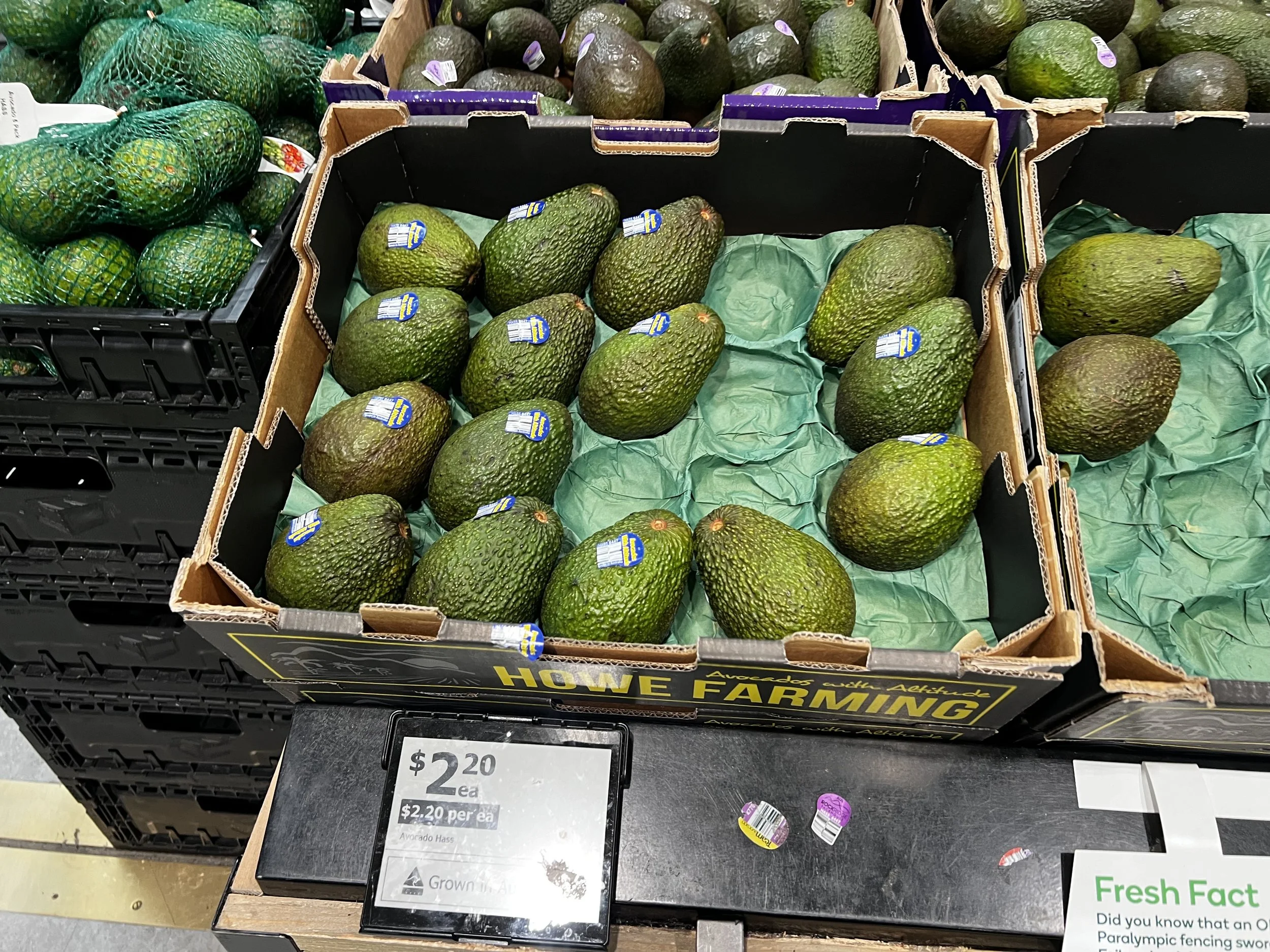 Purpleskin and Howe Farming Hass avocados priced at $2.20ea.