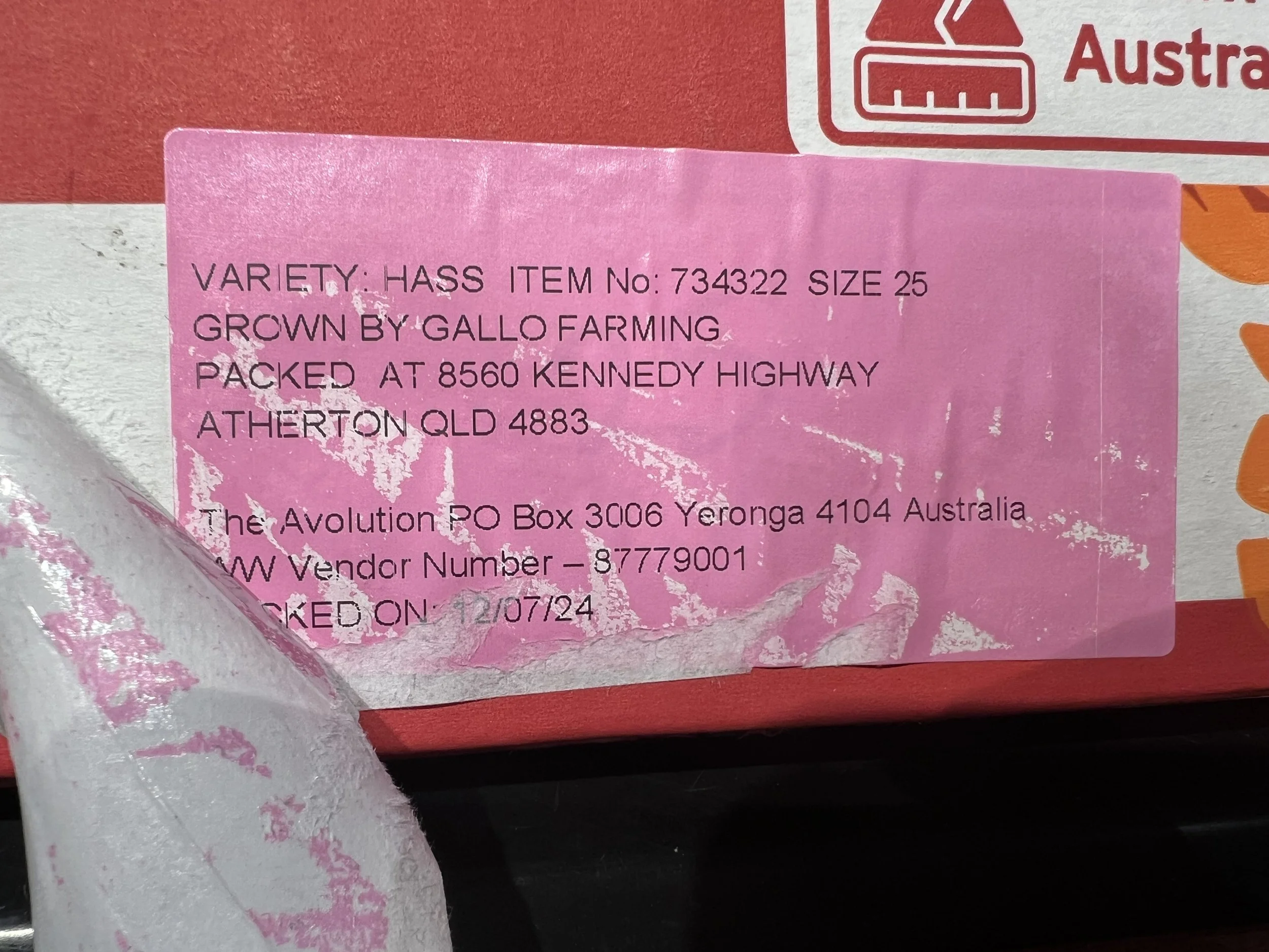 Count 25 loose Hass Avos from Rockridge- $1.80 ea - packed 11th July therefore fruit age is 13 days.