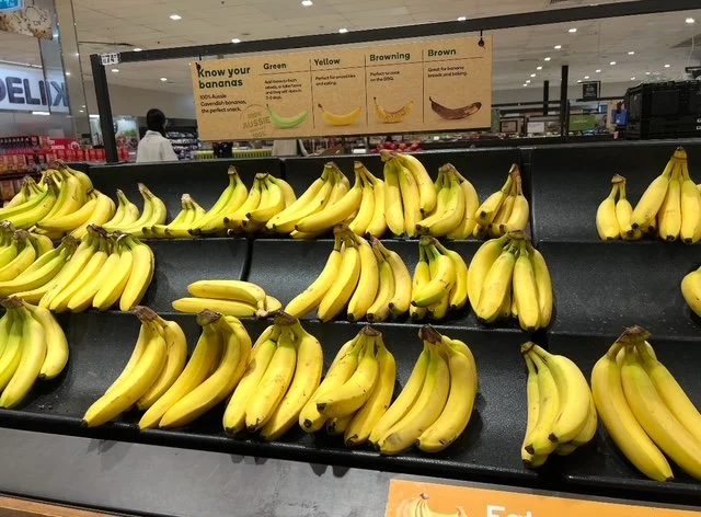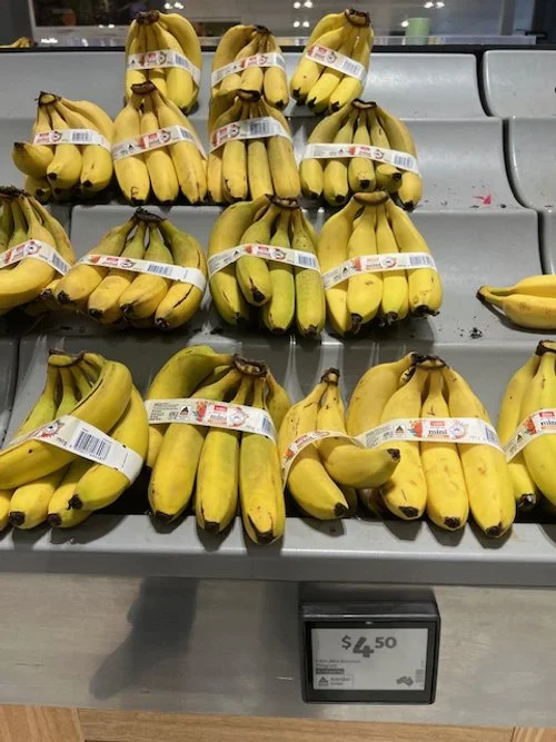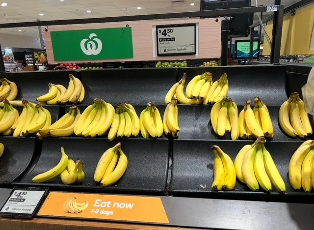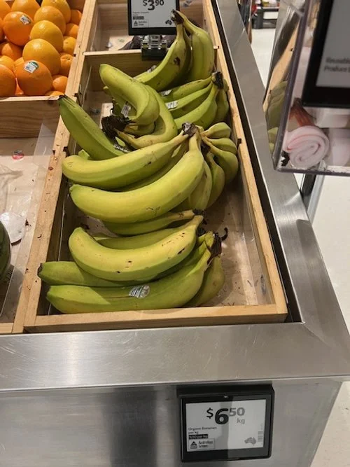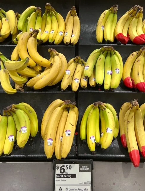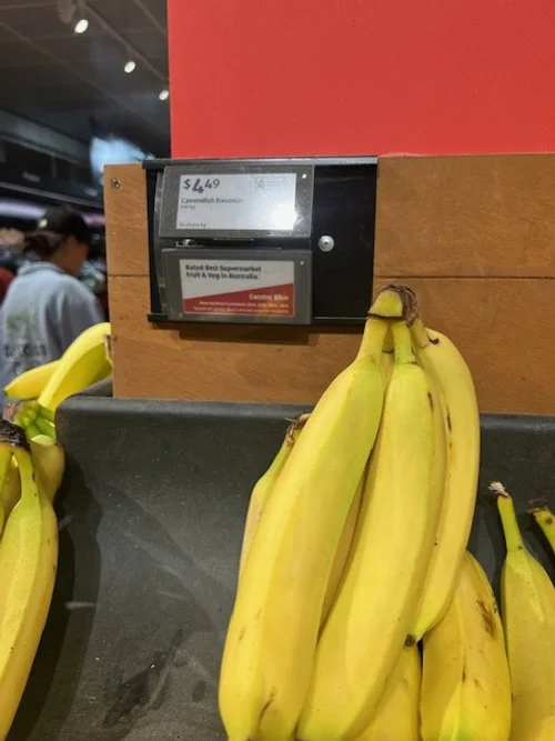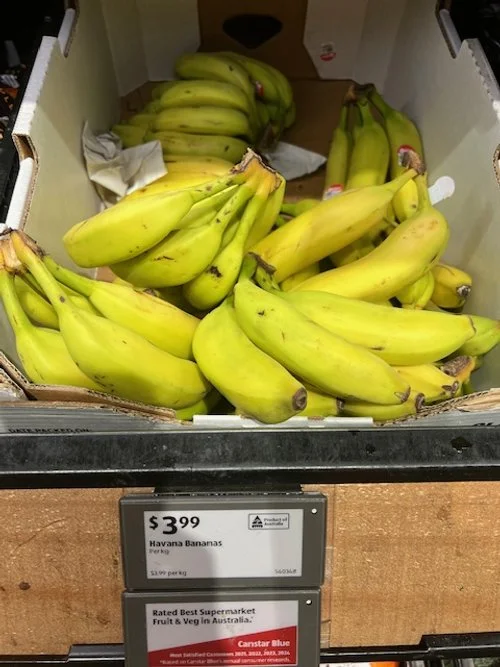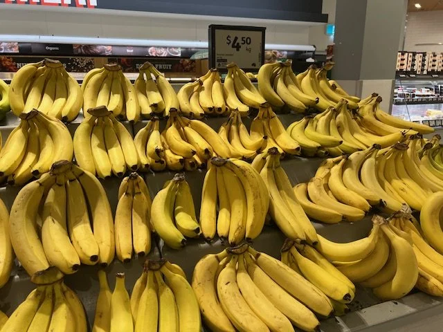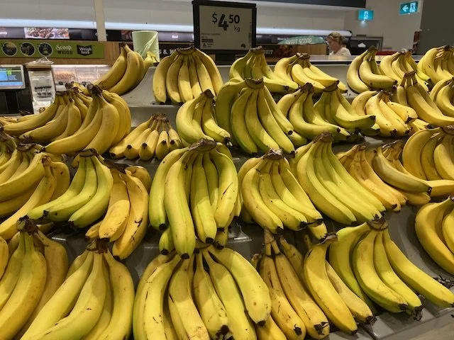 Cavendish Bananas priced at $4.49/kg. Mostly good colour and clean fruit, only minimal with bruising.