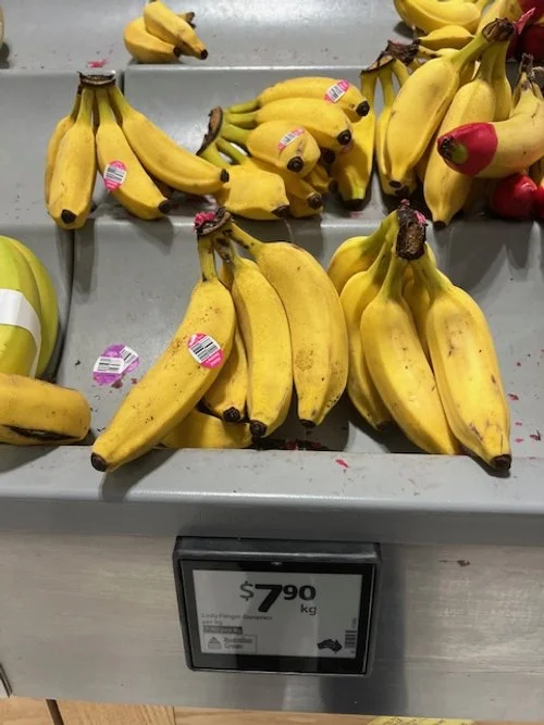 Lady Fingers at $7.50/kg, Red Tipped bananas at $5.90/kg and Organic at $6.50ea.