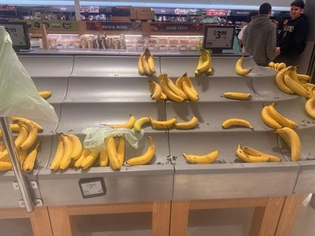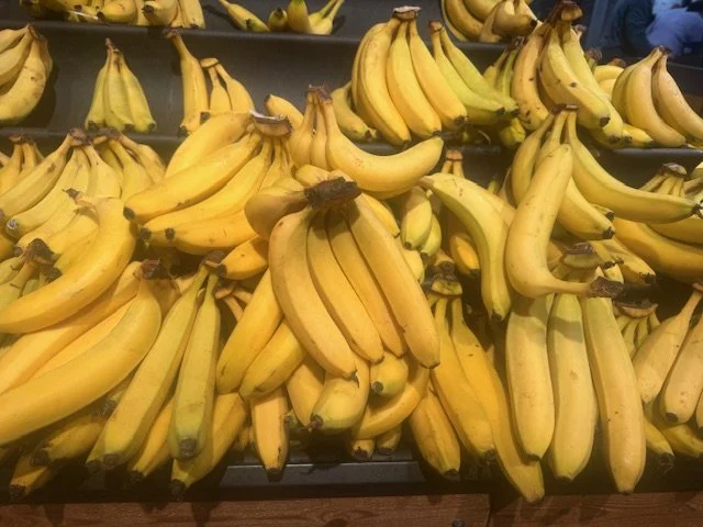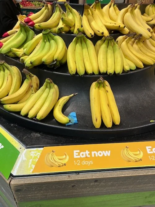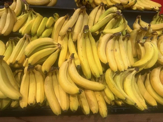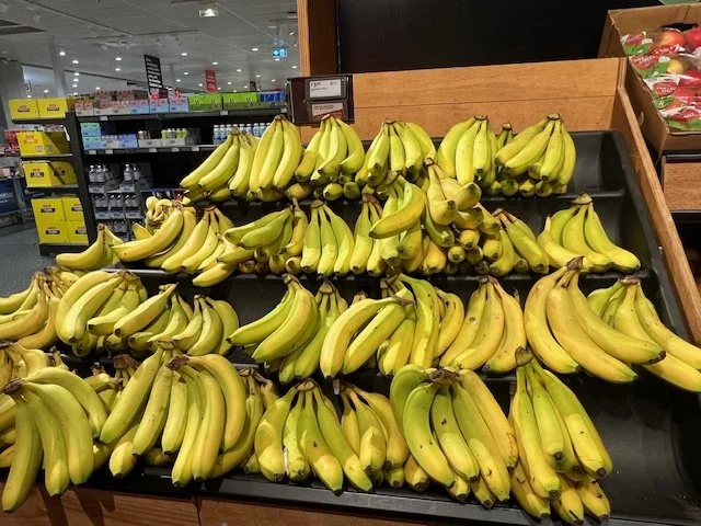 Cavendish Bananas priced at $3.99/k - majority of stock on display somewhat backward with still a way to ripen.