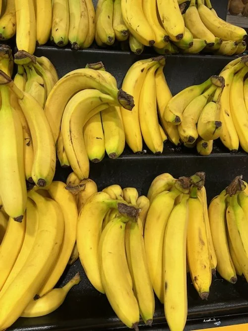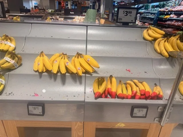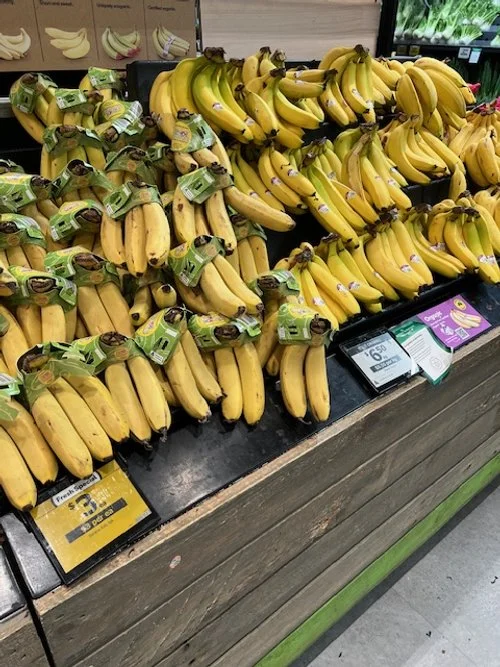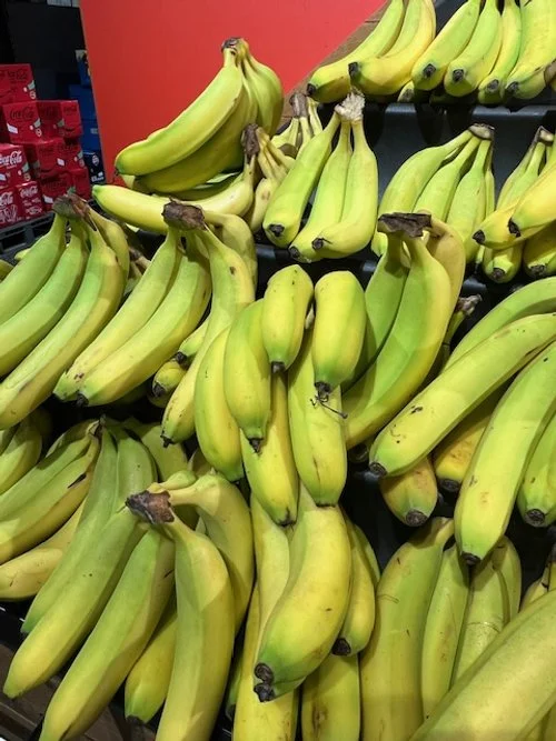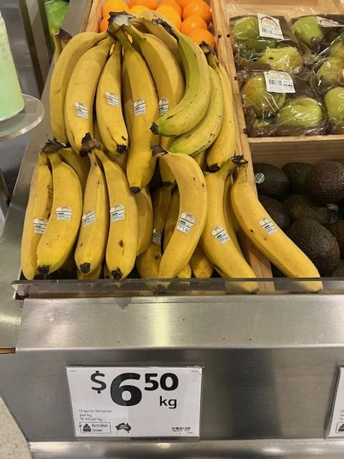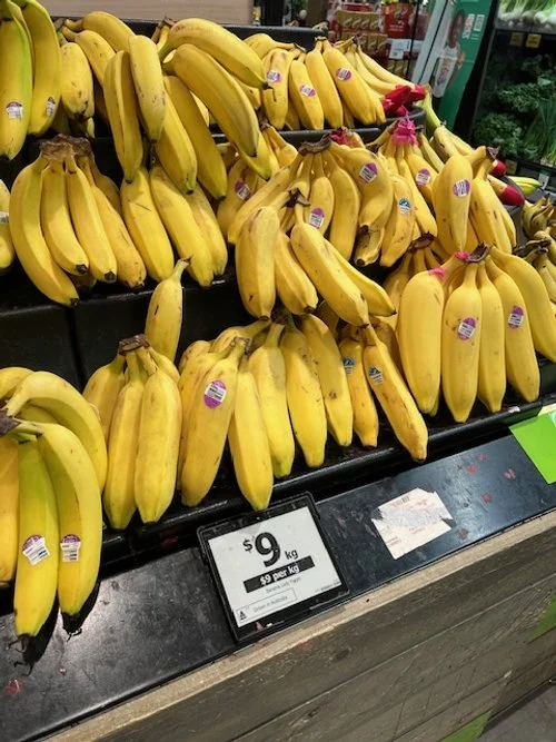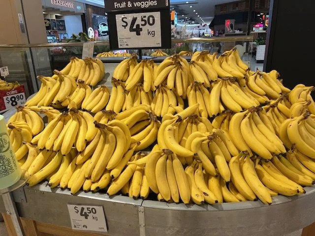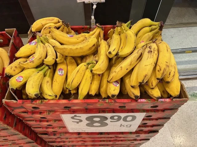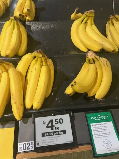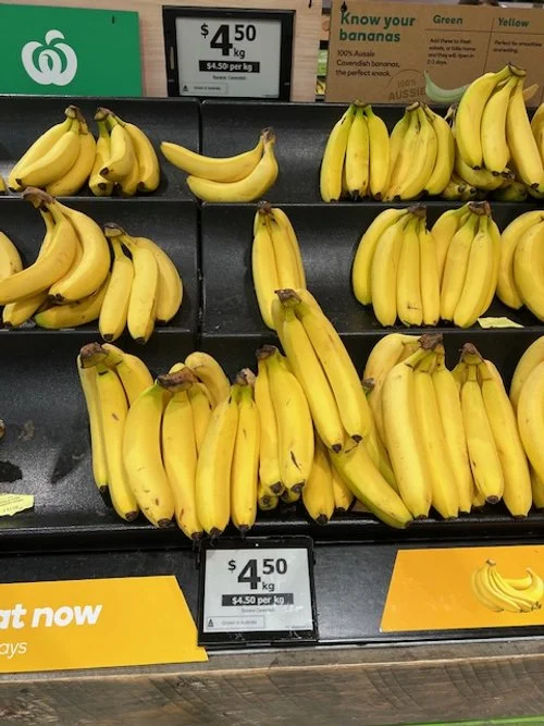Cavendish Bananas priced at $4.49/kg. Mostly good colour and clean fruit, some with bruising.