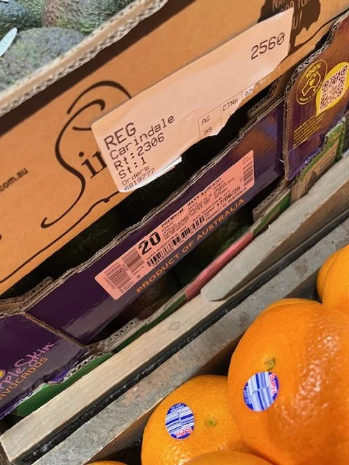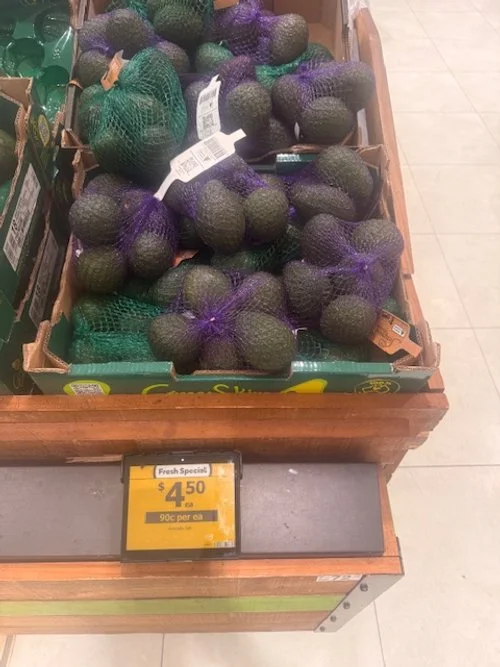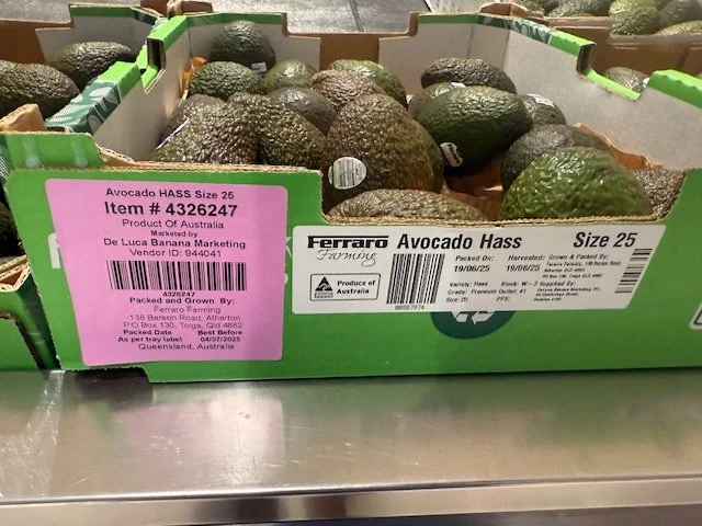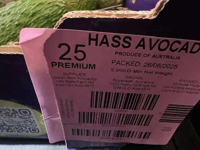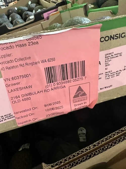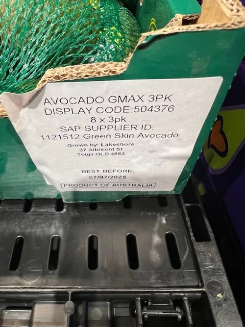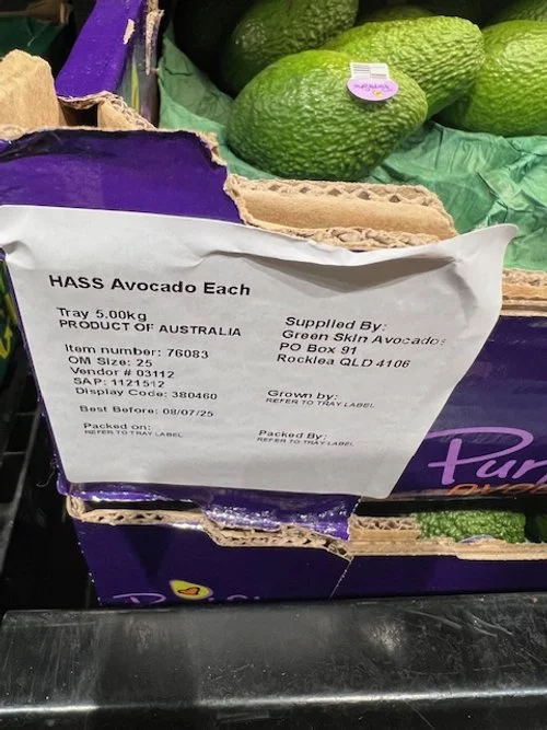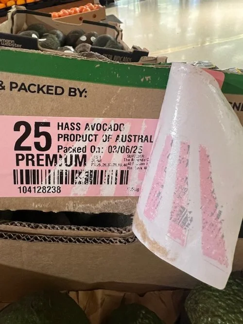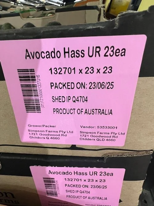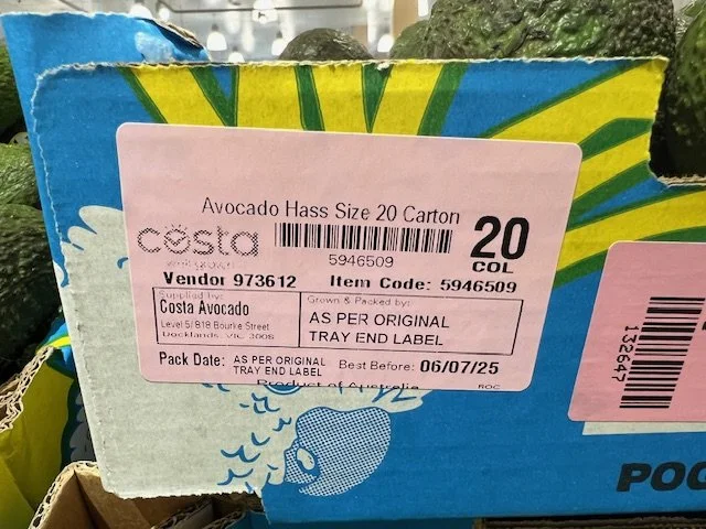 Ct 23/25 Hass at $1.29ea. Supplied by Avo Collective note grower applied pack date of 10th June, yet White label over top states packed date of 21st June. Stock is actually 22 days old.