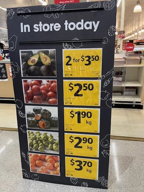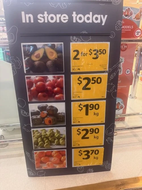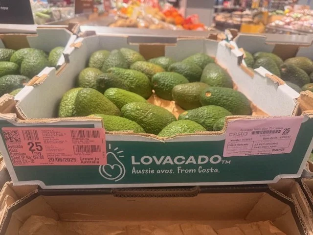 Ct 23-25 Hass Avocados priced at 2 for $3.50ea. Fruit supplied by Simpsons; Costa and Freshmax (Ferraro’s) with packed dates of 19th/20th June so fruit age is 12-13 days.