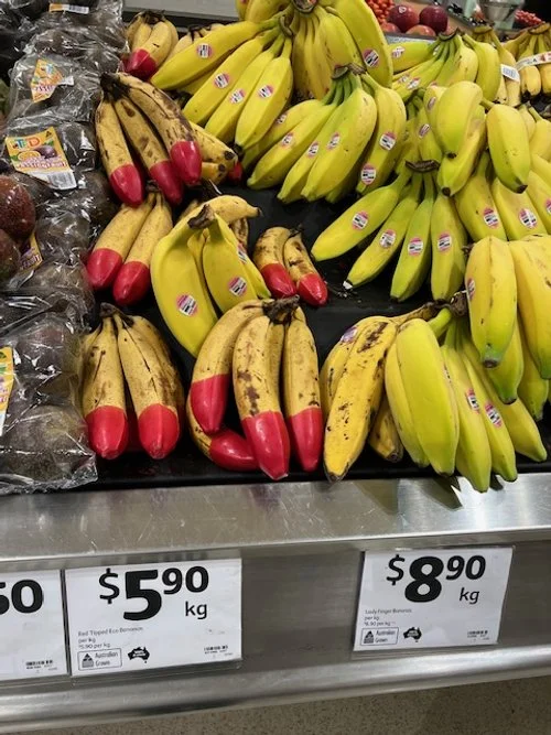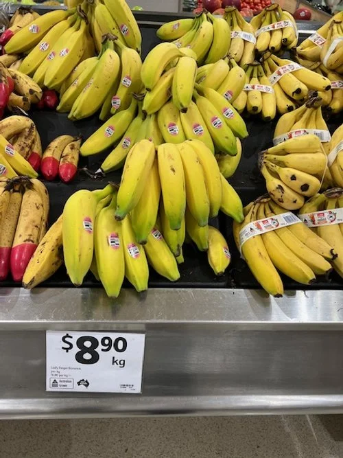 Red Tipped bananas at $5.90/kg and Lady Fingers at $8.90/kg. Organic at $6.50/kg.