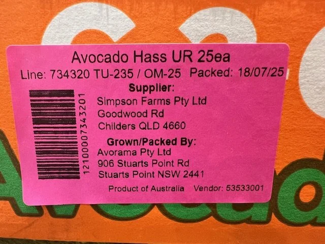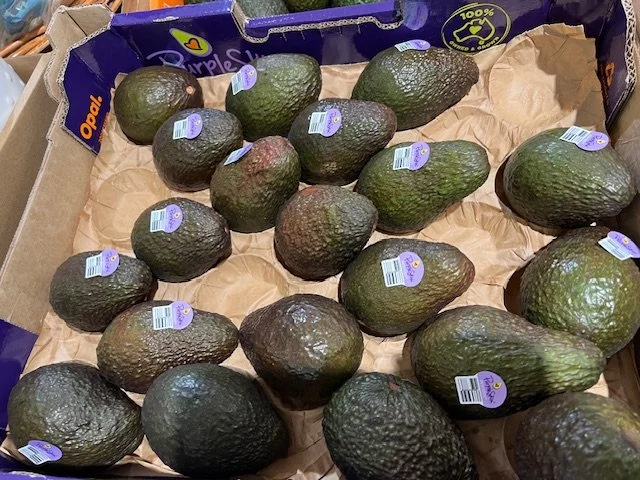 Ct 25 Hass priced $1.50ea. Mix of suppliers including Simpson Farms (via Avorama); Avolution (Donovan Family) Purpleskins (Mt Binga fruit from Blackbutt) and Rockridge.