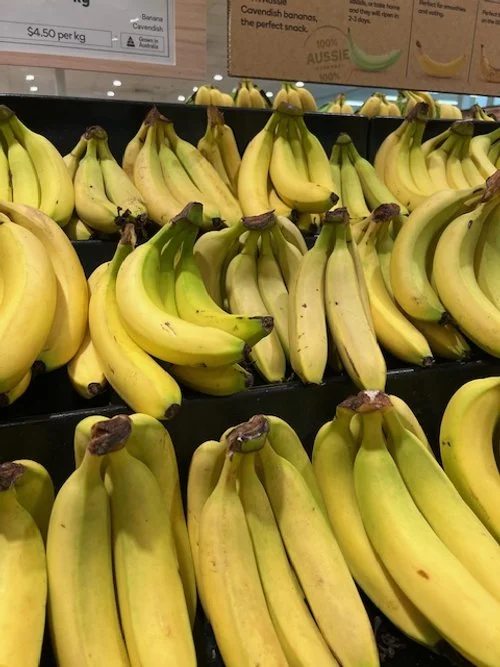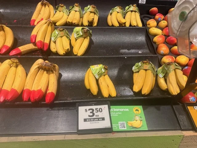 Cavendish Bananas priced at $4.49/kg. Mostly good colour and clean fruit, some with slight bruising and dullness.
