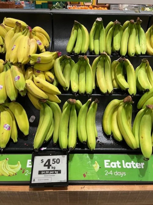Cavendish Bananas priced at $4.49/kg. Mostly good colour and clean fruit, some with slight bruising and dullness.