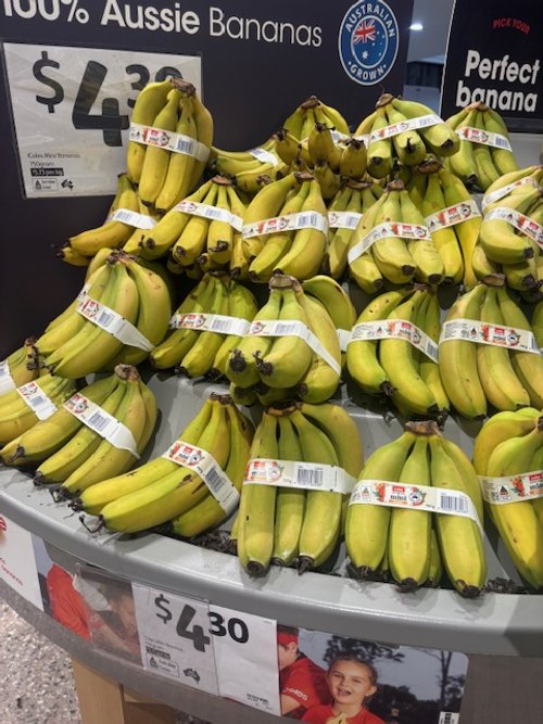 Cavendish at $4.30/kg. Kids packs at $4.30ea. Banana lengths and girths were found to be on the high side of the spec.