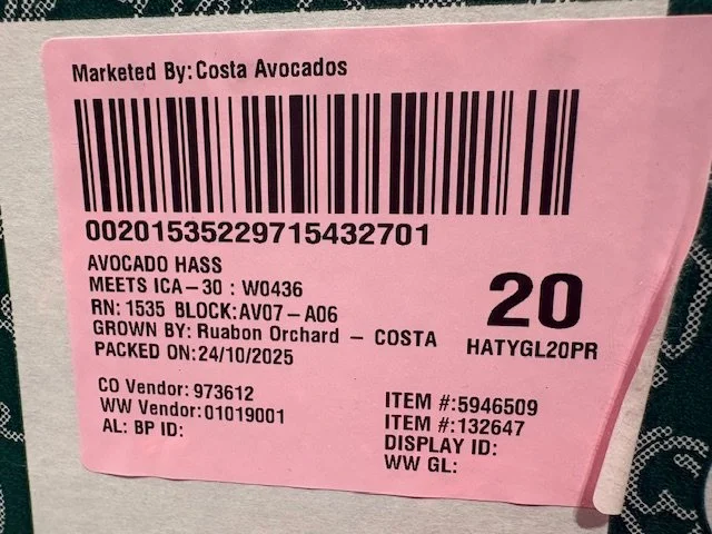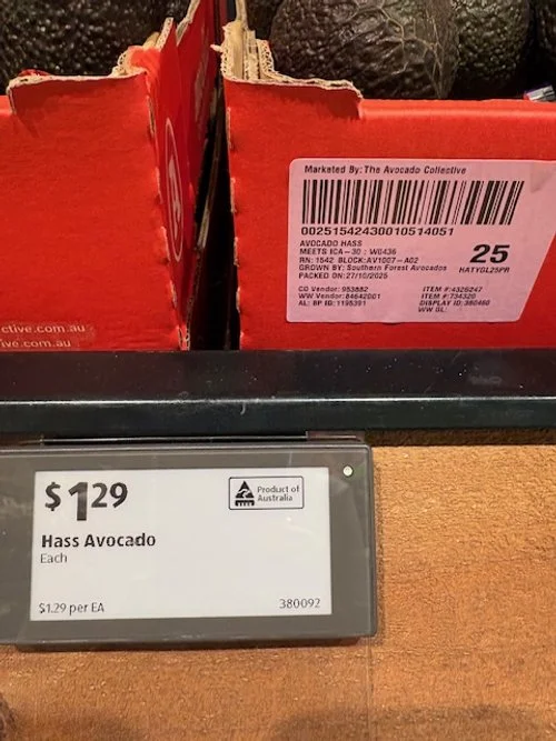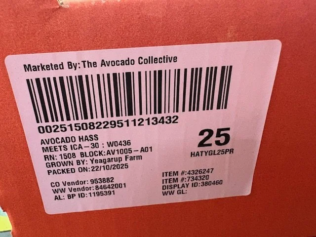 Ct 23-25 Hass ticketed at $1.29ea supplied by Avocado Collective with fruit age being 16 days from date of pack.