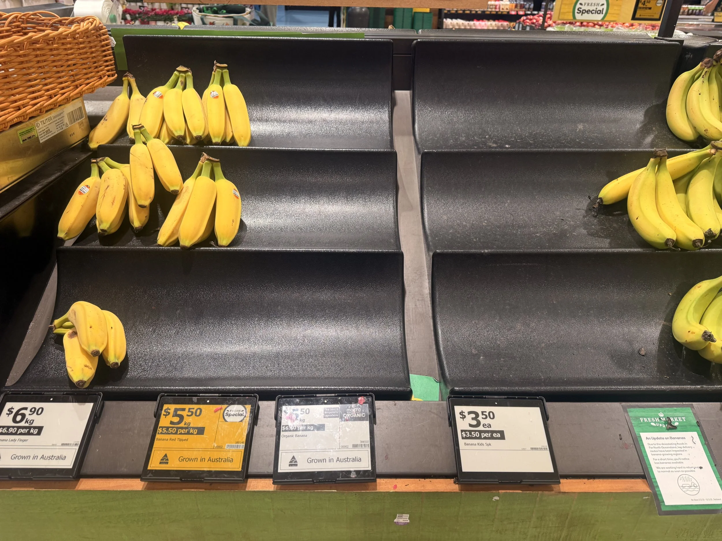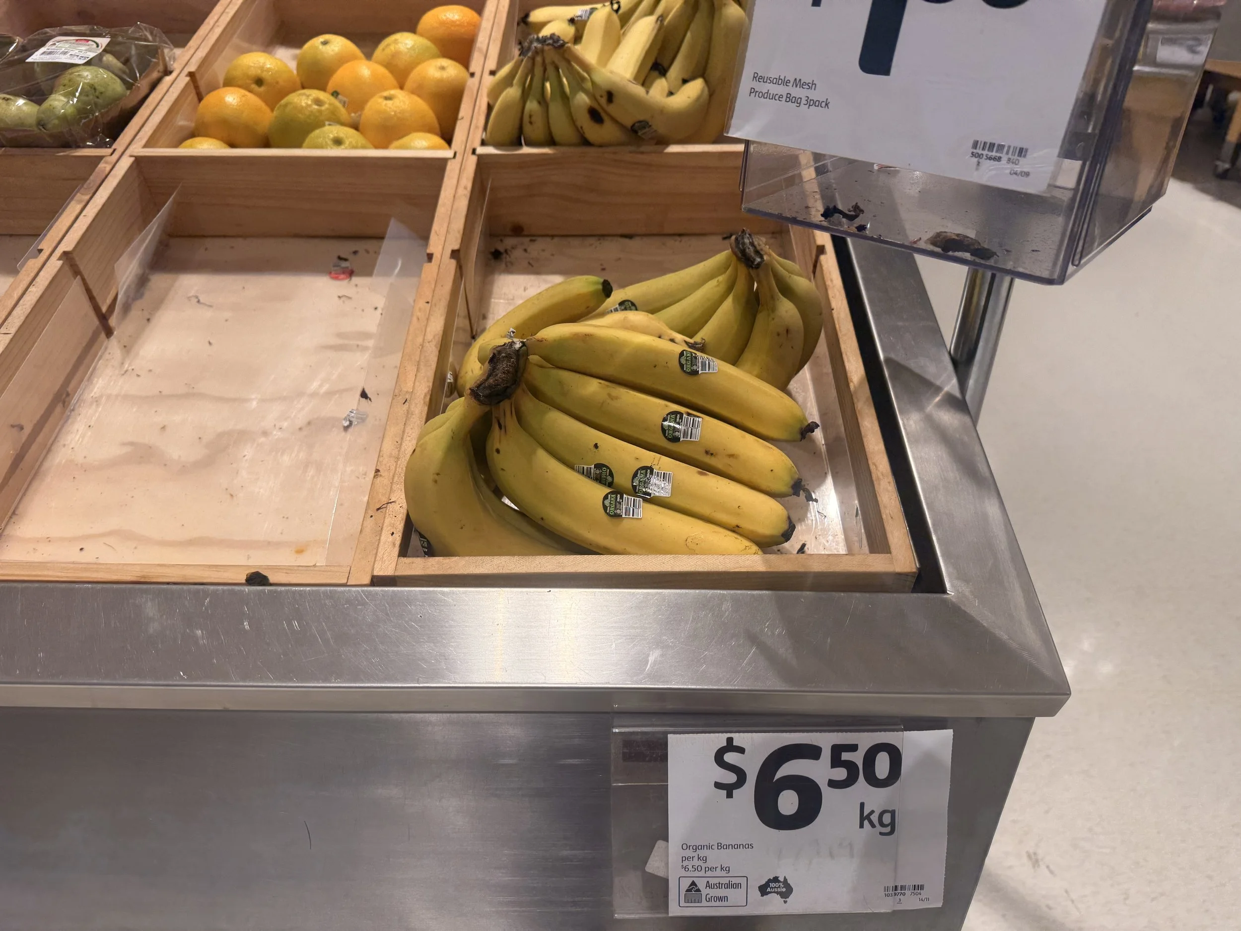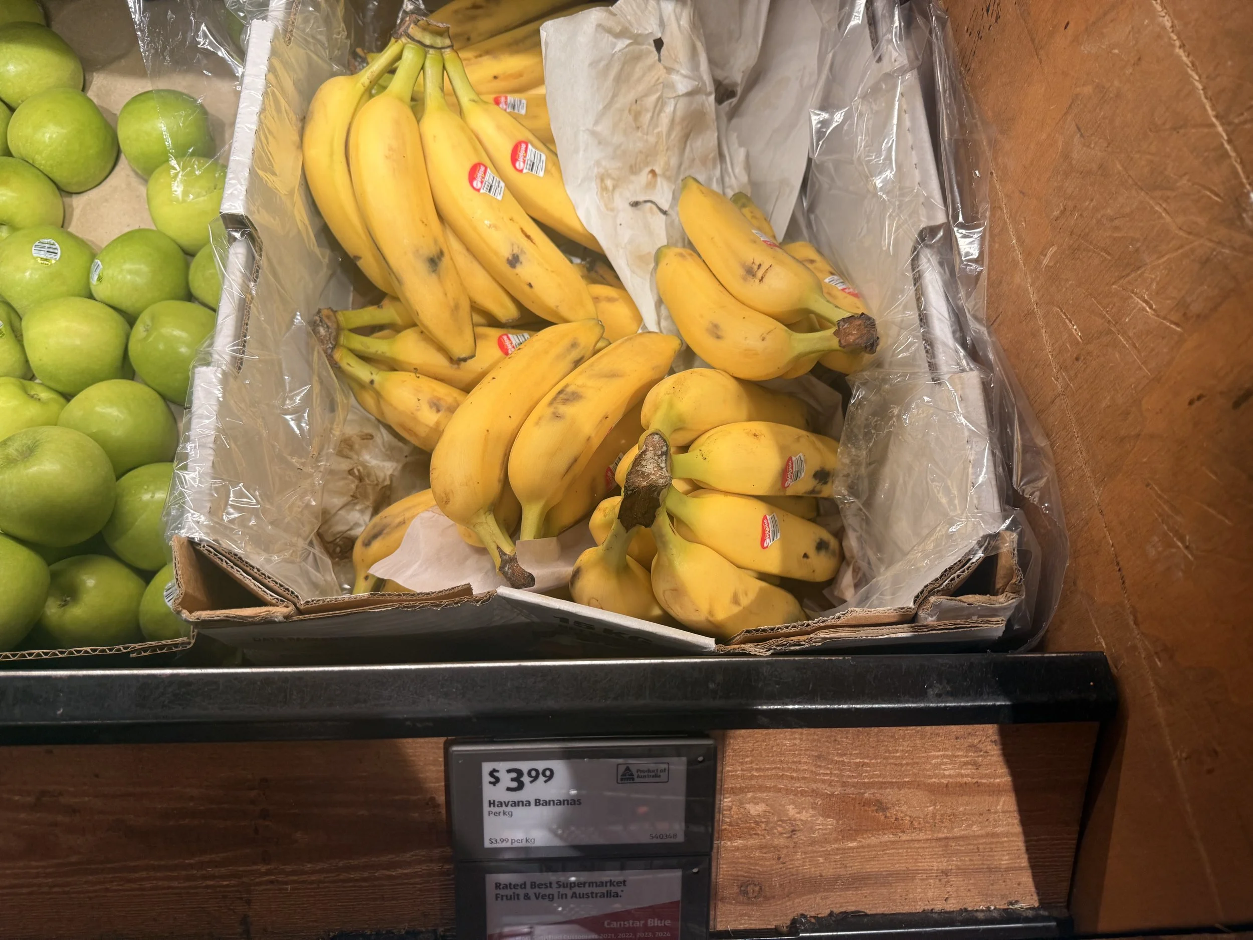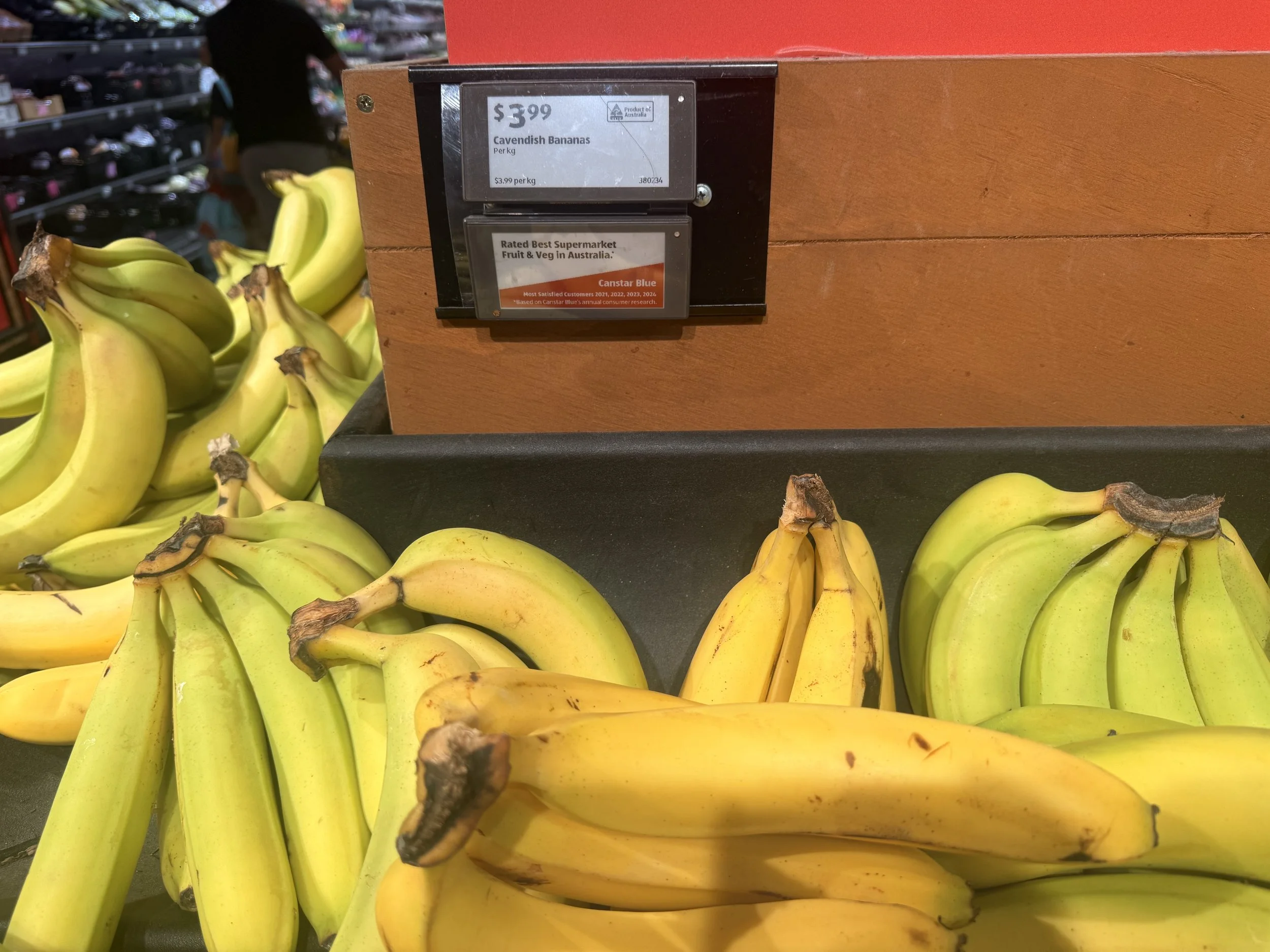 Cavendish priced at $4.00/kg. Appropriately positioned in ‘Eat Now’ and ‘Eat Later’ although not many in ‘Eat Later’. Kids packs at $3.50ea.