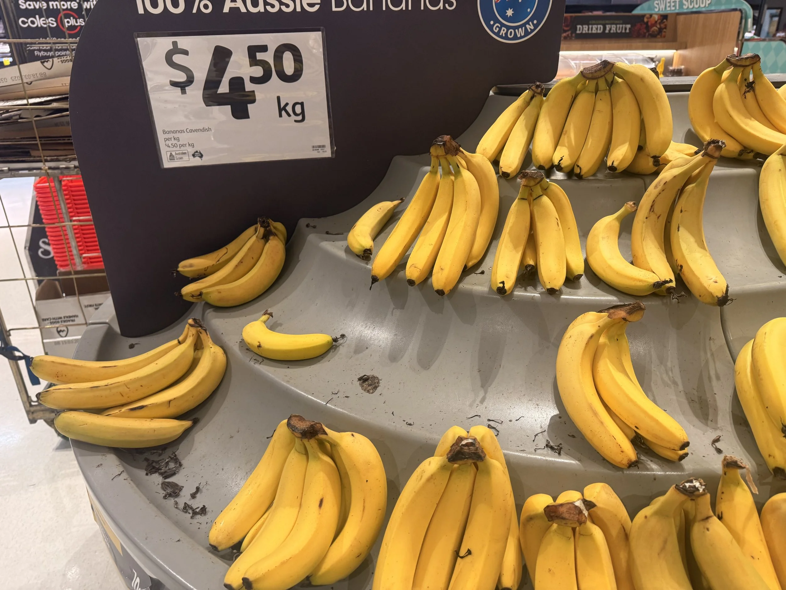 Cavendish priced at $4.50/kg. Appropriately positioned in ‘Eat Now’ and ‘Eat Later’ although not many in ‘Eat Later’. Kids packs at $3.50ea.