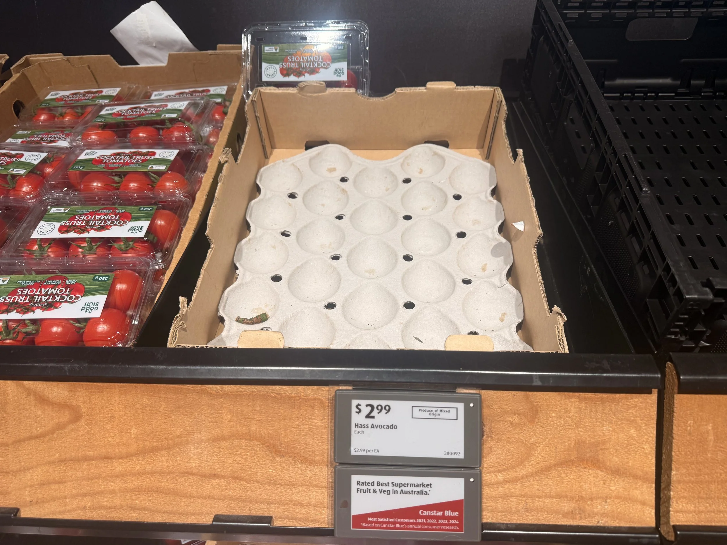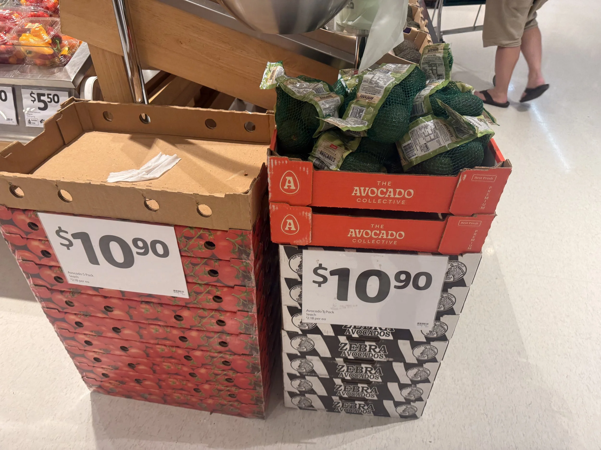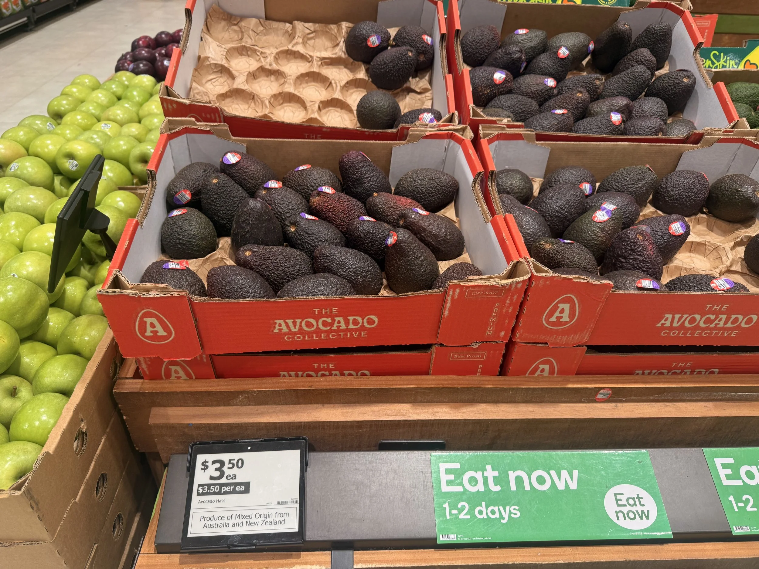 WA and NZ Ct23-25 loose Hass Avocados - ticketed at $3.50 ea. Packed 21st-24th Jan, so fruit 18-22 days old.