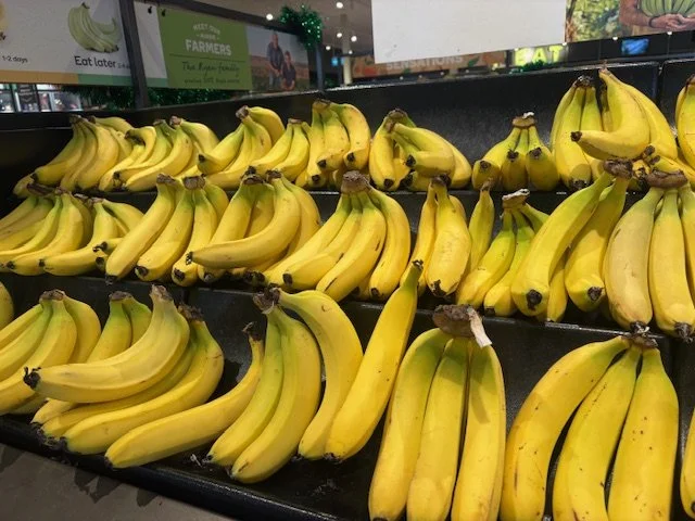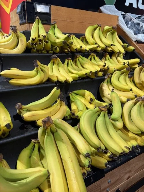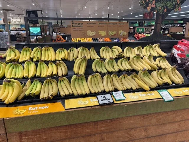 Banana displays varied across stores visited, noted a little sap staining and light skin marking present, along with fruit of a dull bloom on a shelf or two .