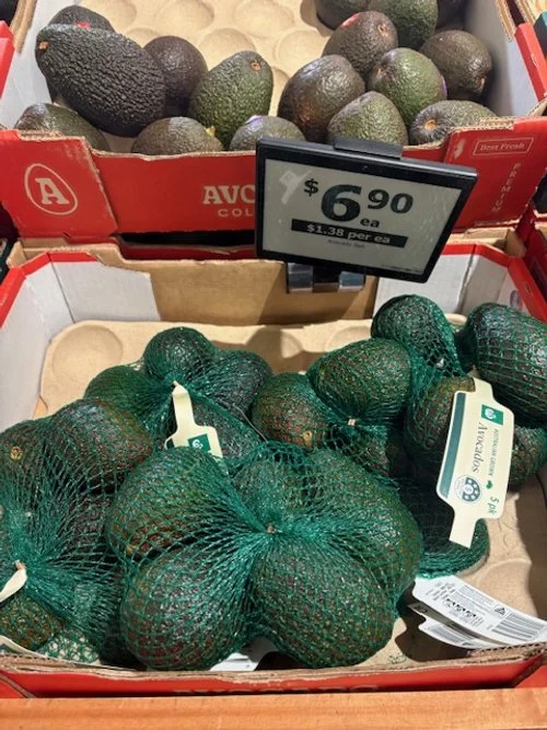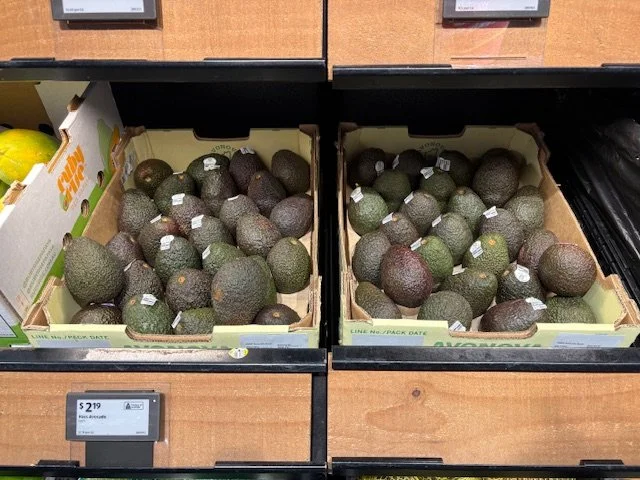 Ct 20-25 Hass Avocados priced at $2.50ea.