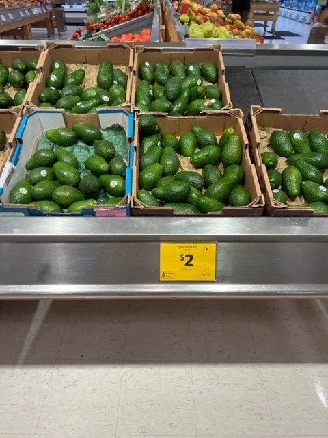 • Greenskin Shepards at $1.80ea on special. Fruit displayed on one side of an A Frame double sided display just inside the entrance to the produce department - the rear of the display contained Purpleskin Hass ticketed at $2.50ea. Note larger stickers applied to fruit that has been ripened more ready for the “Eat Now” offering.